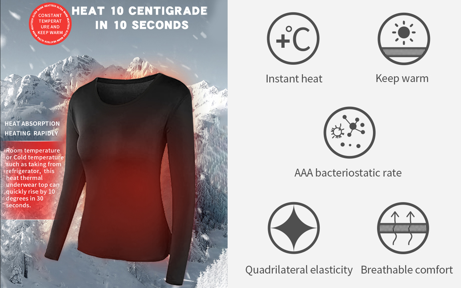 【الحرارة في كل مكان】في أي وقت وأينما كنت ترتدي هذا القميص الحراري النسائي، يمكنه تسخين 10 درجة مئوية في 10 ثوانٍ بسرعة. درجة حرارة الغرفة أو درجة الحرارة الباردة مثل أخذها من الثلاجة، يمكن أن ترتفع هذه الملابس الداخلية الحرارية بسرعة بمقدار 10 درجات في 30 ثانية. علاوة على ذلك، إذا كنت في الخارج، يمكن لهذه الملابس الداخلية أن تستمر في التسخين بالأشعة تحت الحمراء البعيدة للوصول إلى درجة حرارة أعلى، وتجعلك تشعر بالدفء.
