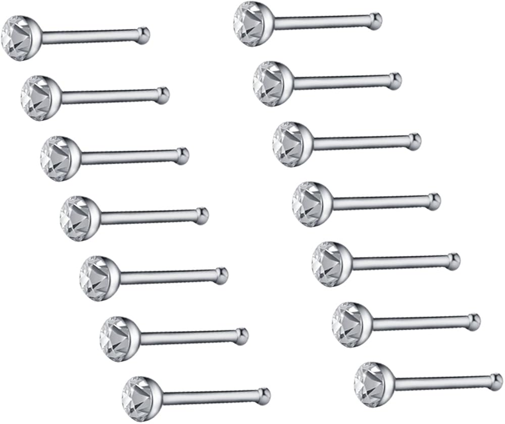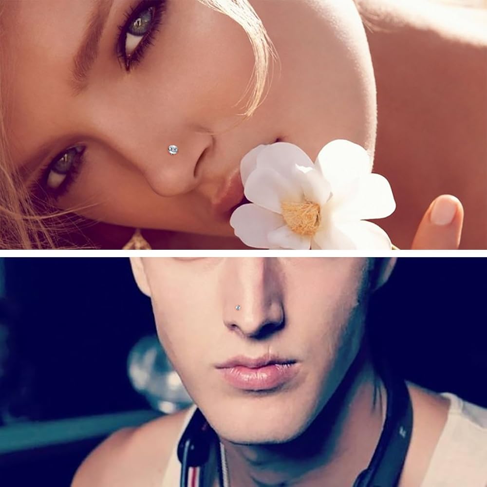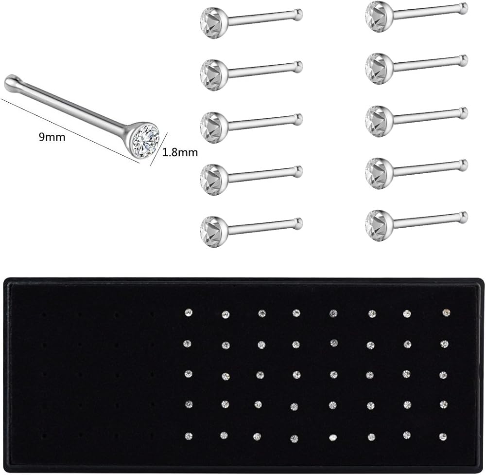 الحجم العادي: عبوة واحدة (40 قطعة)، مجموعة الصندوق 26 غرام، طول القضيب حوالي 8 ملم، قطر الزركونيا المكعب حوالي 1.7 ملم. أقراط الأنف قابلة للانحناء ومرنة، يمكنك ثنيها بالأصابع أو الكماشات لمنعها من السقوط وتناسب أنفك تمامًا