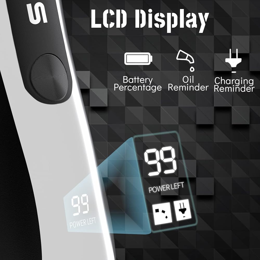 LCD Display and LED Light - The LCD display of body shavers for men shows the percentage of battery remaining can remind you to charge in time and add oil in time. The LED light offers illumination for a thorough and clean trim.