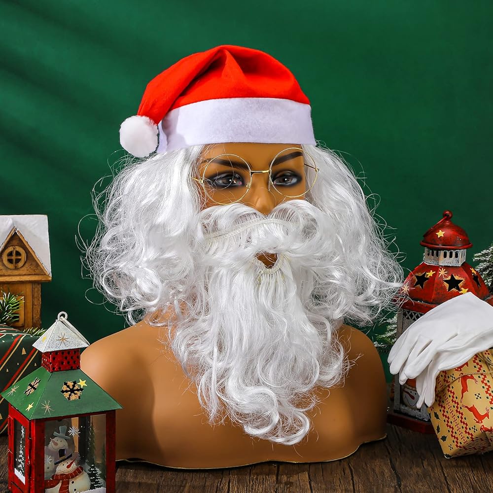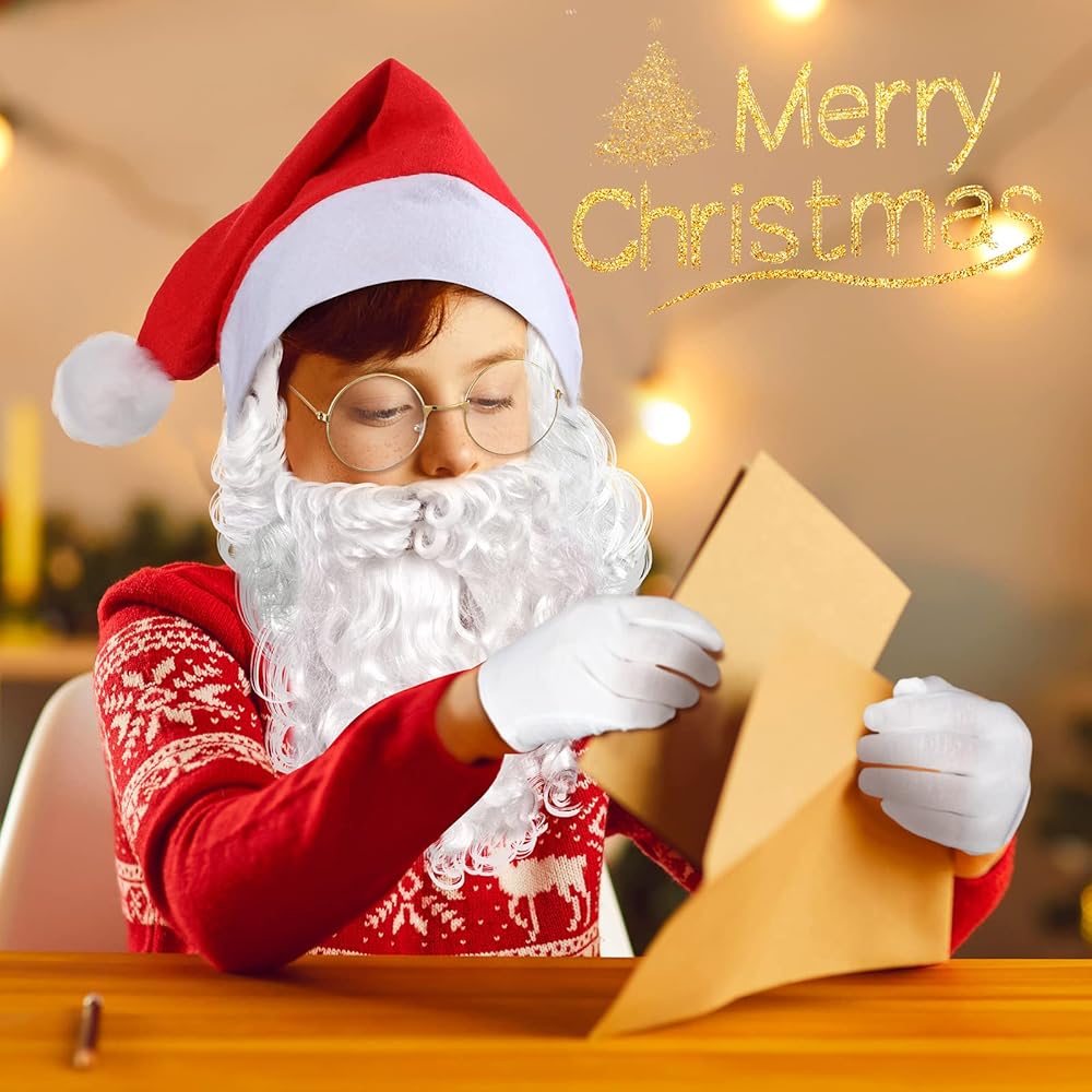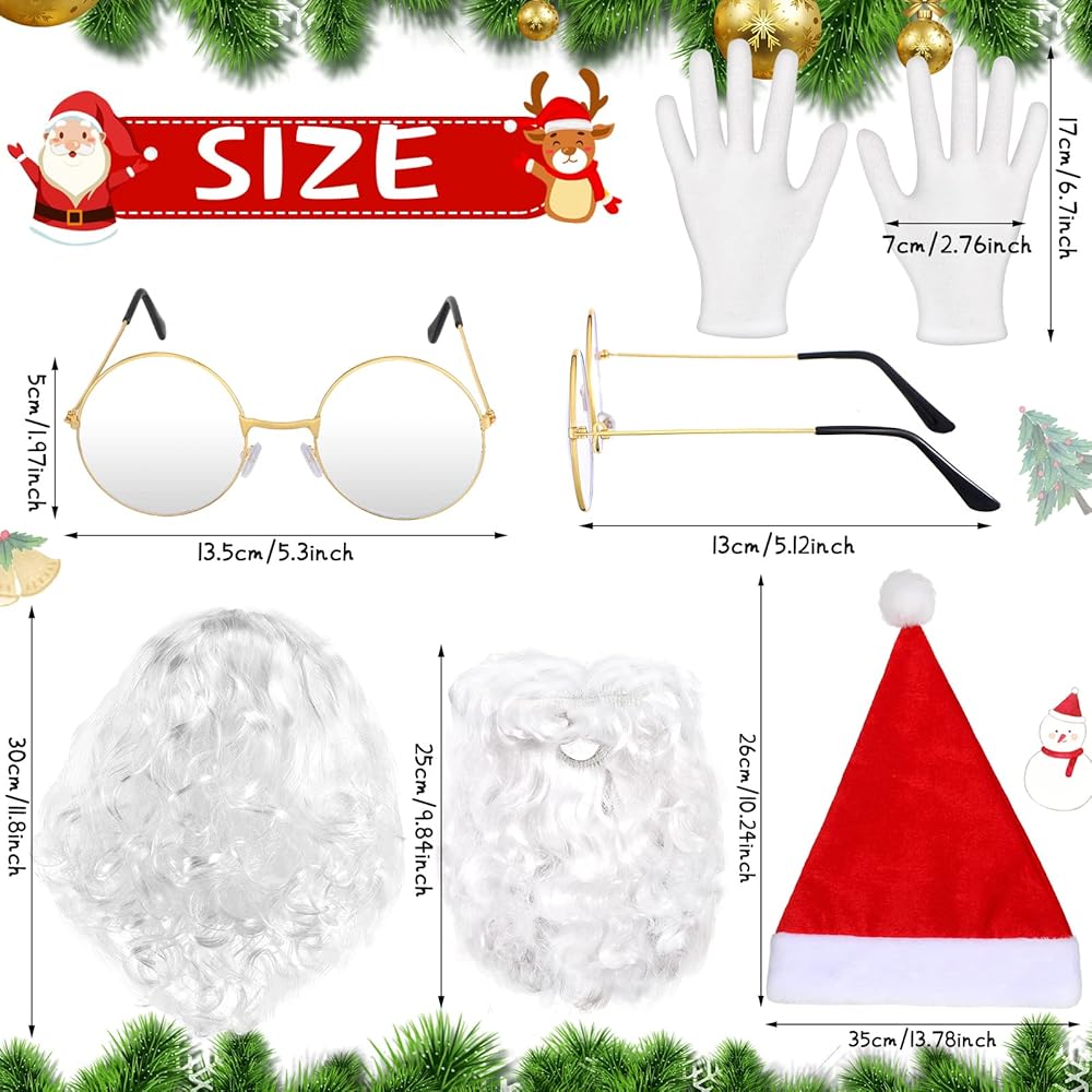Christmas Santa Costume Set: this package includes 1 Santa wig, 1 white beard, 1 pair of Santa Claus glasses, 1 pair of Santa gloves and 1 Santa hat, a nice combination for your kids to dress themselves on Christmas, thus getting pleasure