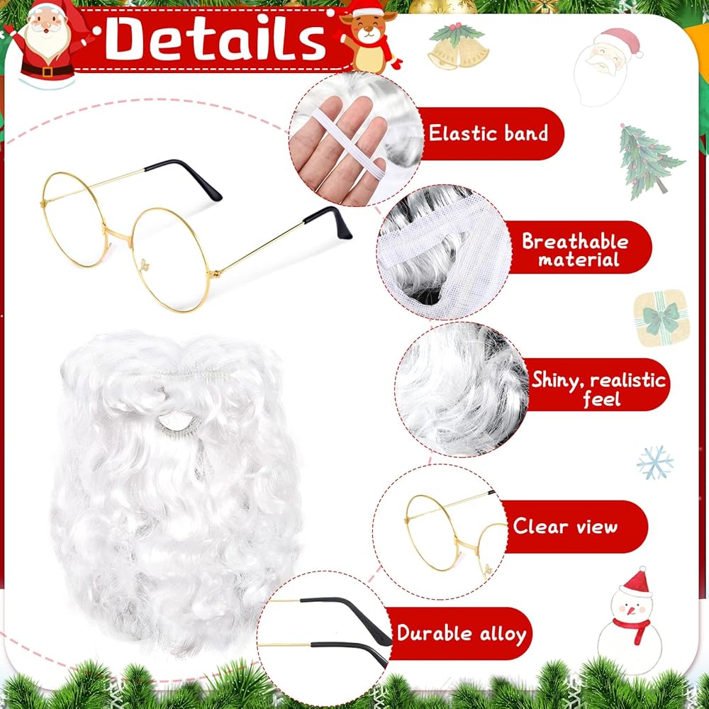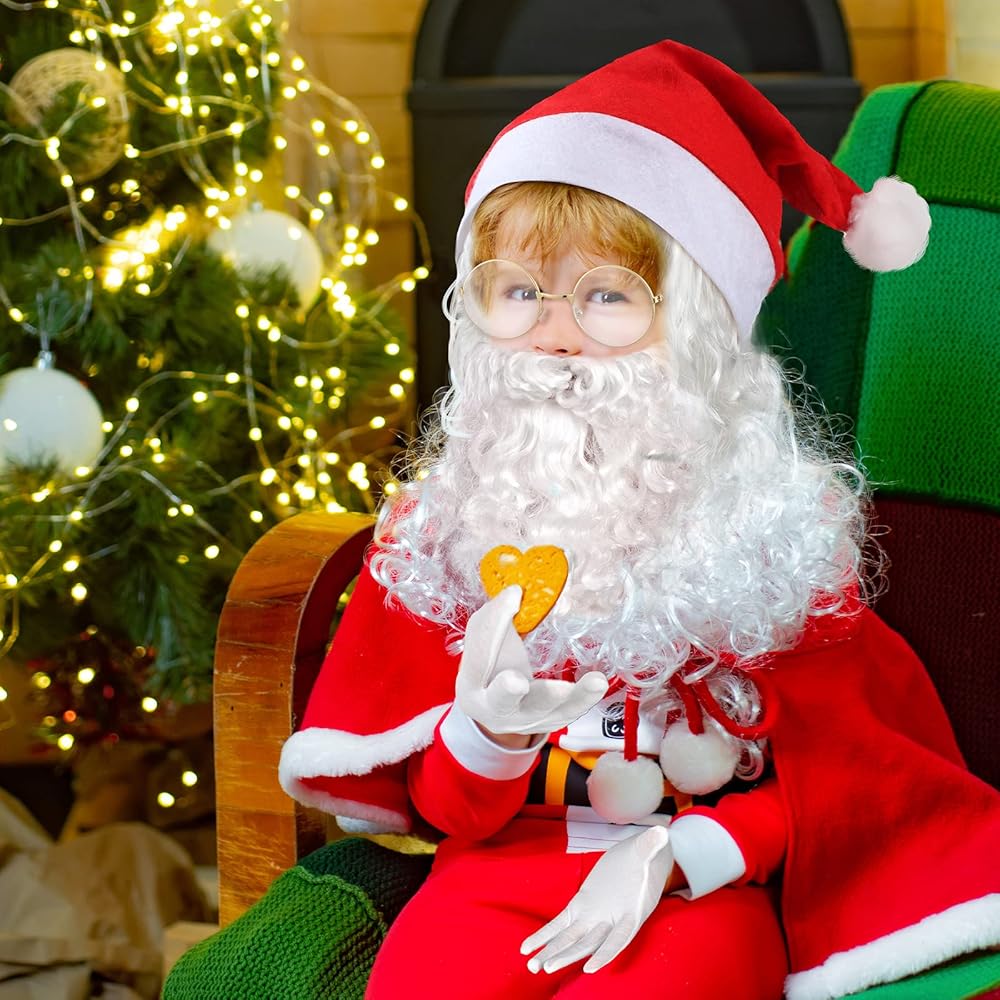 Lifelike Santa Beard and Wig: glasses, Santa beard and wig set are made of quality material, serviceable and dependable, soft and cozy to feel, friendly to skin, look natural and realistic, and long and wavy style fit Santa well; While round glasses are lightweight and safe, make your kids attractive and cute
