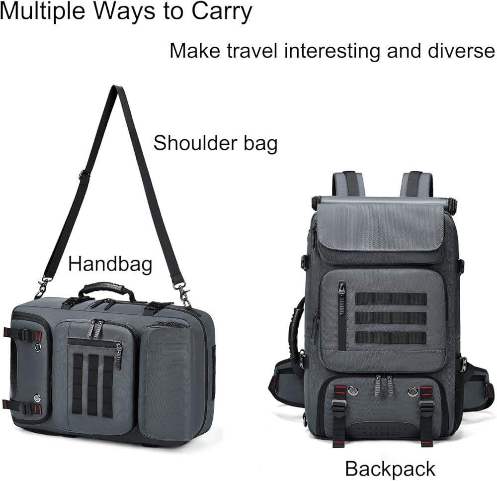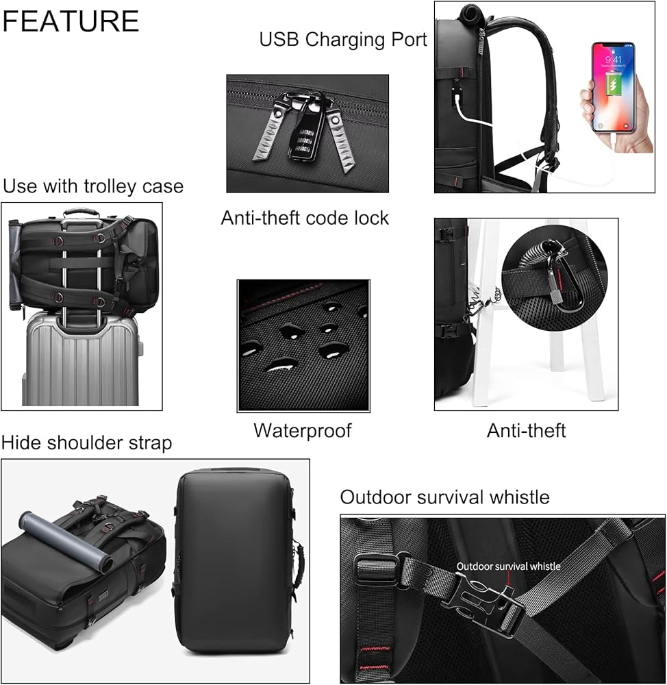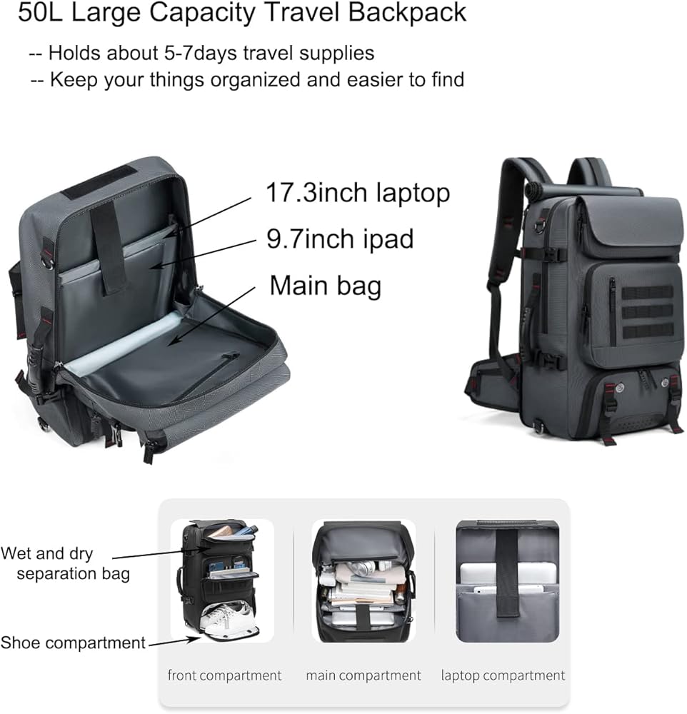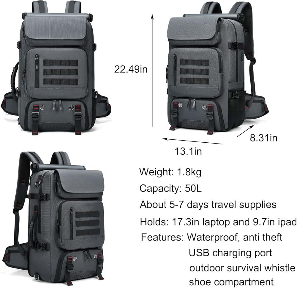 • الحجم والمواد المتينة: حقيبة ظهر كبيرة الحجم للسفر: 21.68 × 13 × 7.88 بوصة (55 × 33 × 20 سم)، السعة: 50 لتر، الوزن: 4.18 رطل (حوالي 1.9 كجم). حقيبة الظهر التجارية مصنوعة من قماش أكسفورد عالي الجودة والبوليستر والجلد، وهي مقاومة للماء والصدمات وناعمة.