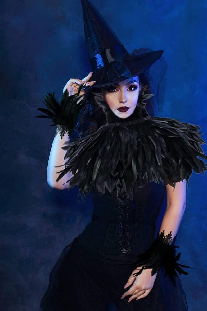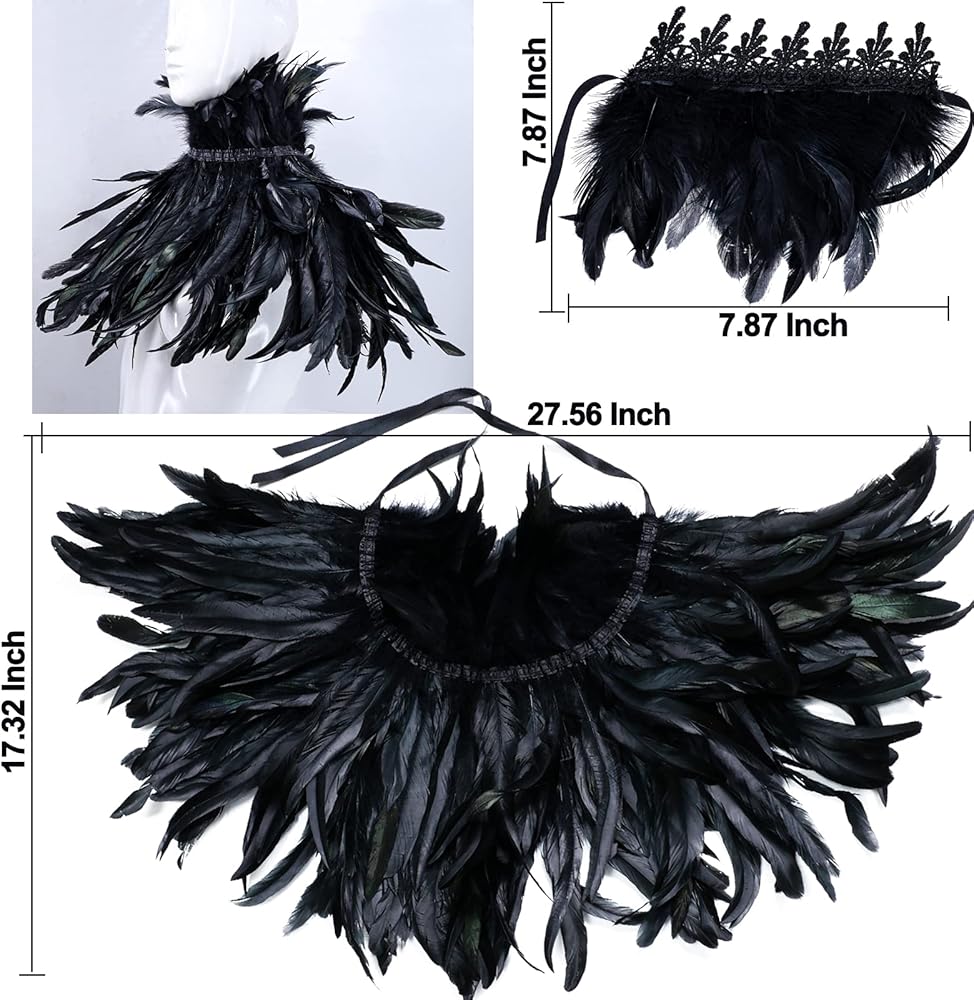 القوطية الأسود الحقيقي ريشة الرأس شال الكتف أجنحة قلادة قلادة مع 1 زوج الأصفاد ريشة، للجنسين الأزياء ريشة الرأس تتغاضى شال المعطف، هالوين تأثيري حلي حزب للنساء الرجال