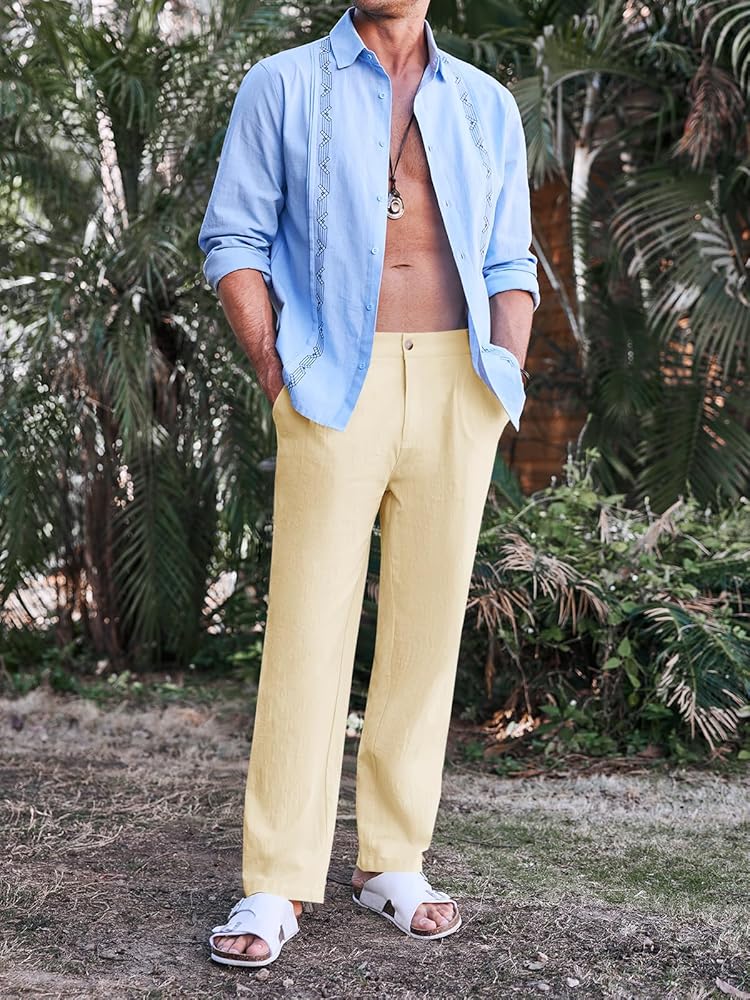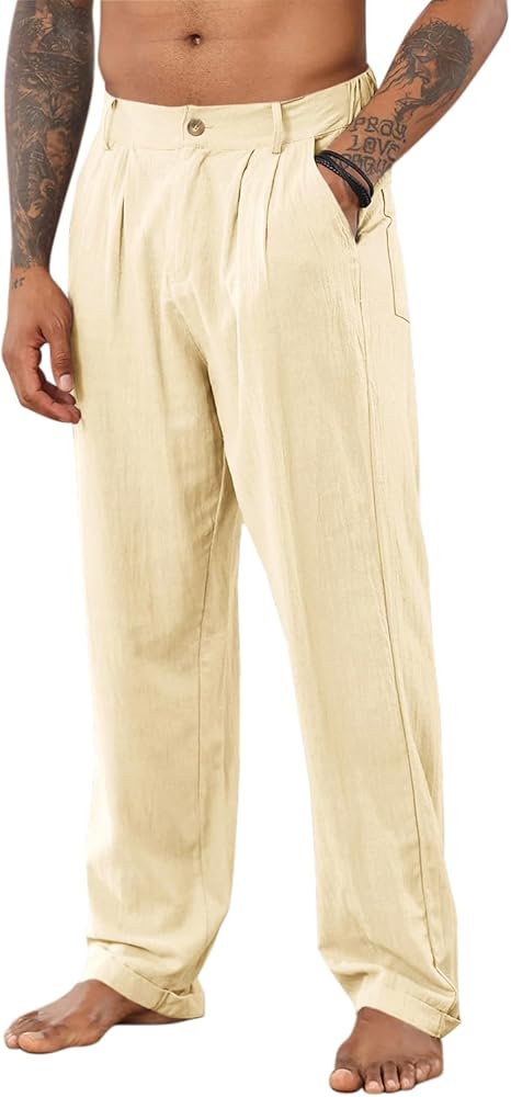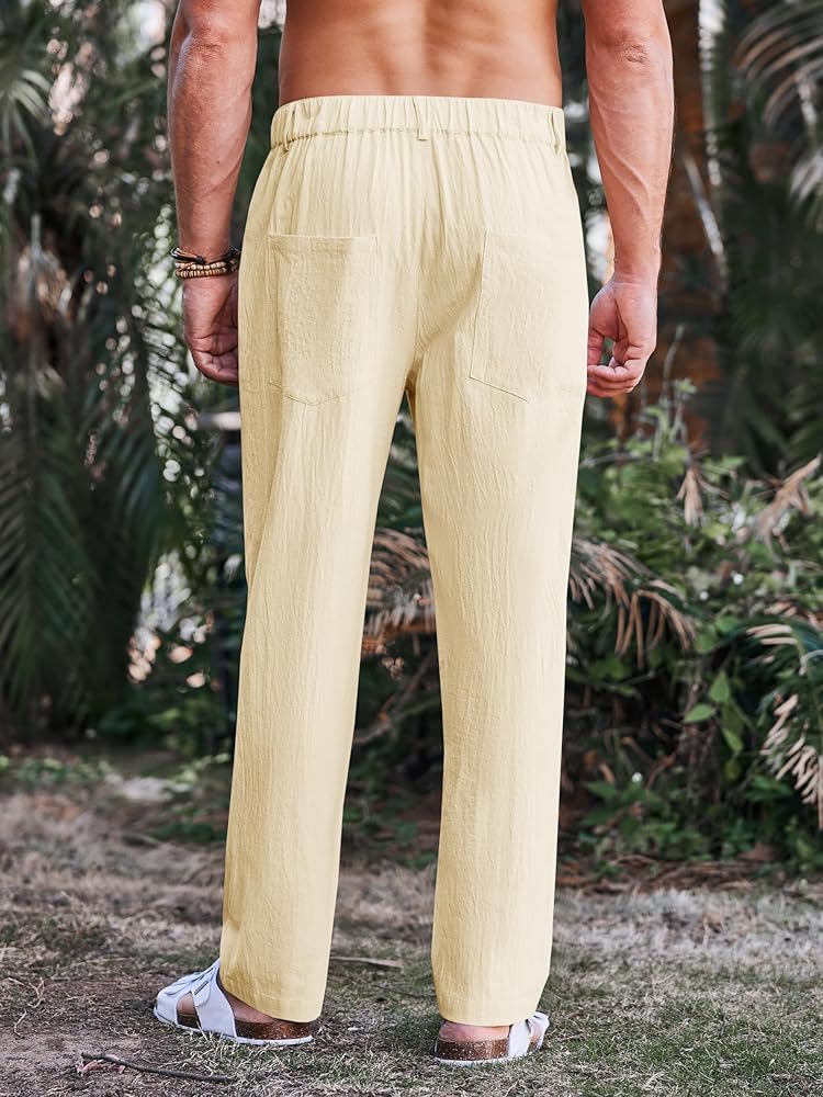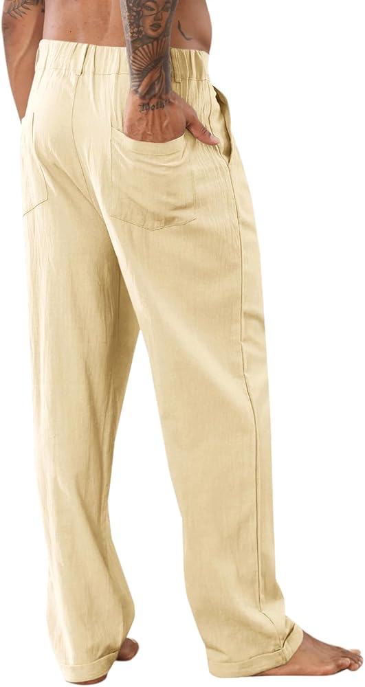 المادة: بنطال الشاطئ الفضفاض هذا مصنوع من نسيج الكتان القطني عالي الجودة، صديق للجلد، ناعم، مسامي وممتص للعرق، يبقيك منتعشًا ومسترخيًا طوال الوقت.