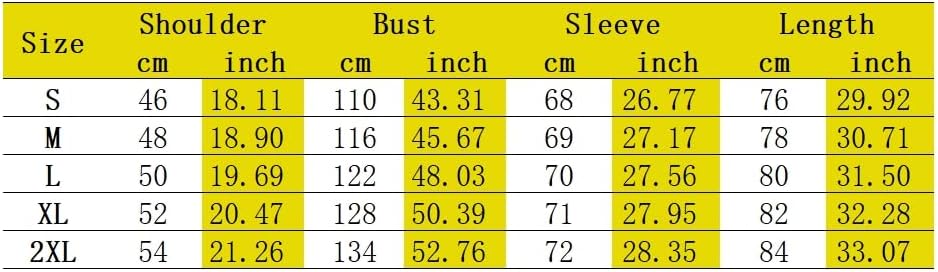 * المقاس: L-----الكتف: 50 سم/19.69 بوصة-----الصدر: 122 سم/48.03 بوصة-----الكم: 70 سم/27.56 بوصة-----الطول: 80 سم/31.50 بوصة