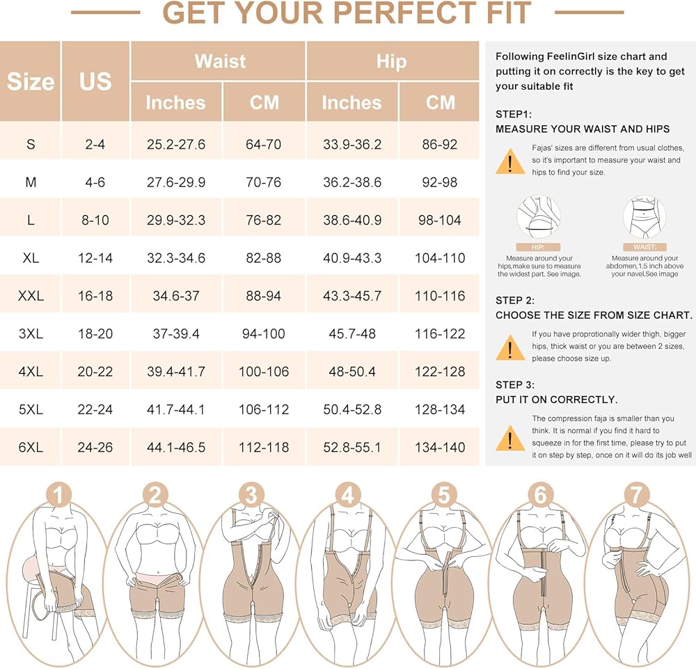 احصل على مقاسك المثالي: فاجا الضغط أصغر مما تعتقد. يرجى قياس محيط خصرك وأردافك لاختيار المقاس، راجع جدول المقاسات الموجود في إحدى الصور اليسرى. إذا كان مقاسك بين مقاسين، فيرجى اختيار مقاس أكبر لتوفير الراحة طوال اليوم. من الطبيعي أن تجد صعوبة في الضغط عليه للمرة الأولى، فيرجى محاولة وضعه على الرجوع إلى "كيفية وضعه"، بمجرد أن يقوم بعمله بشكل جيد.