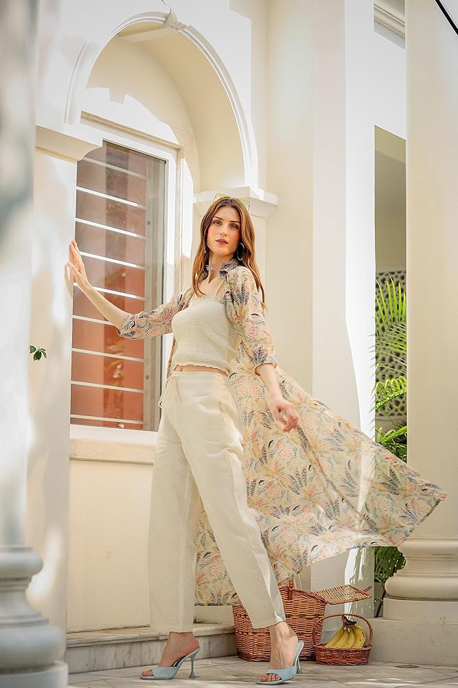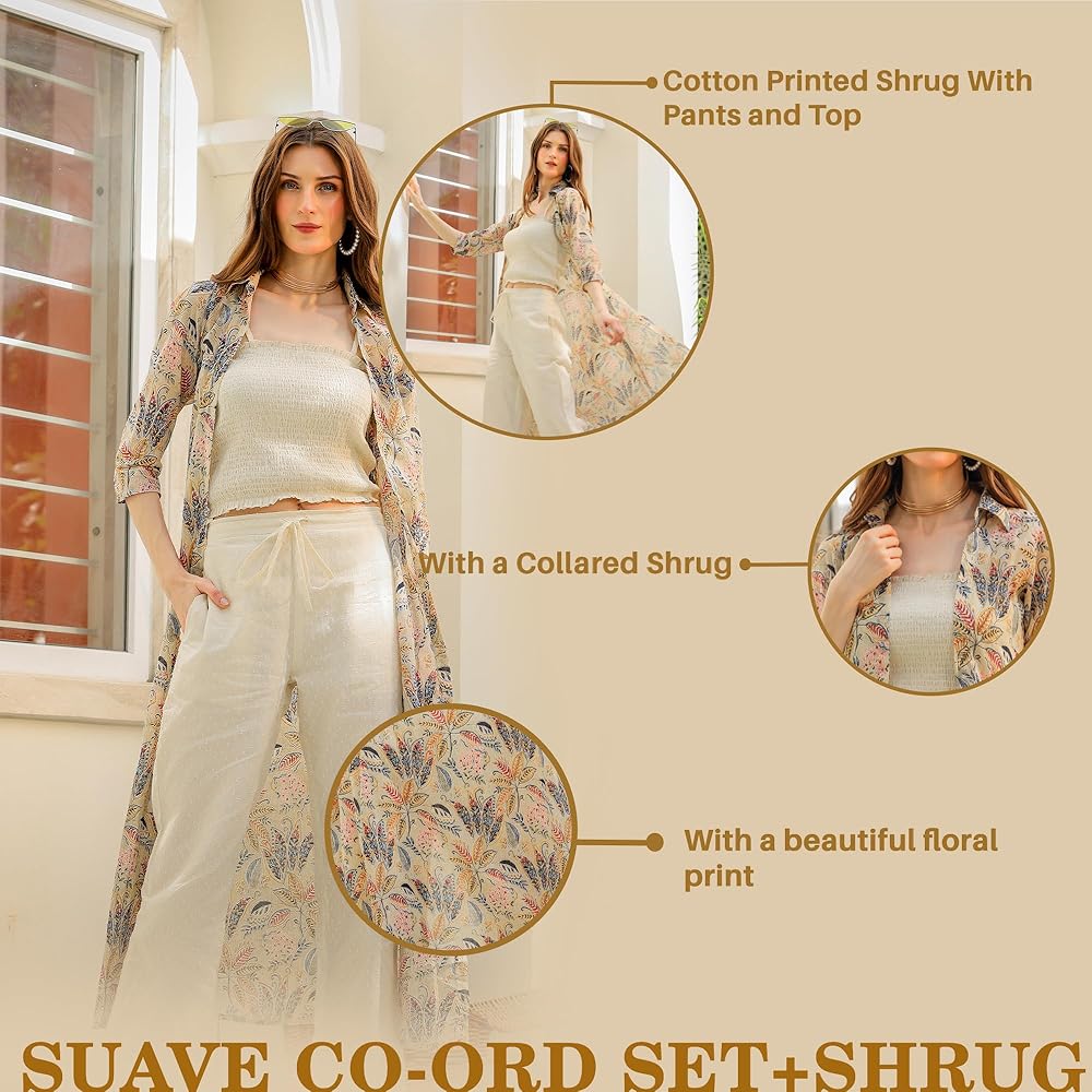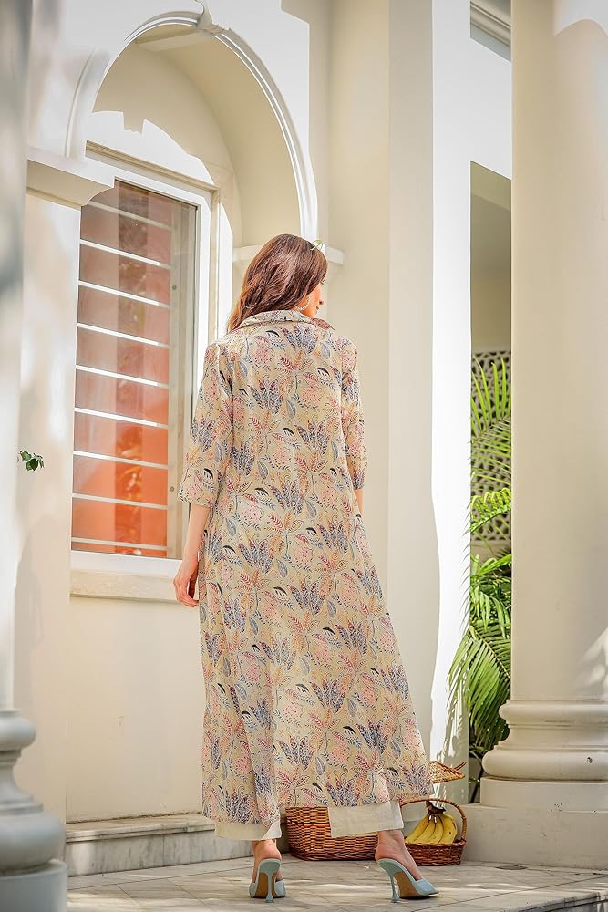 طقم من القطن كاجوال برقبة دائرية للنساء من FASHION DWAR مع 3/4 كم، قطعة داخلية وسروال باللون الأبيض الفاتح، جزء خارجي مطبوع - متعدد الألوان