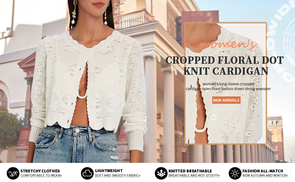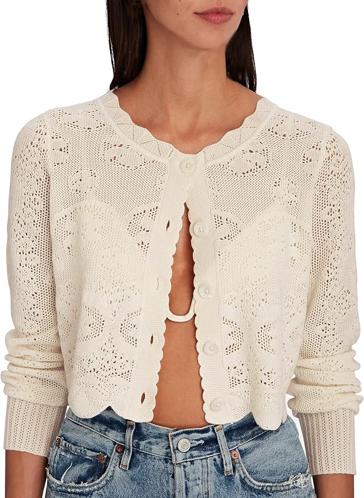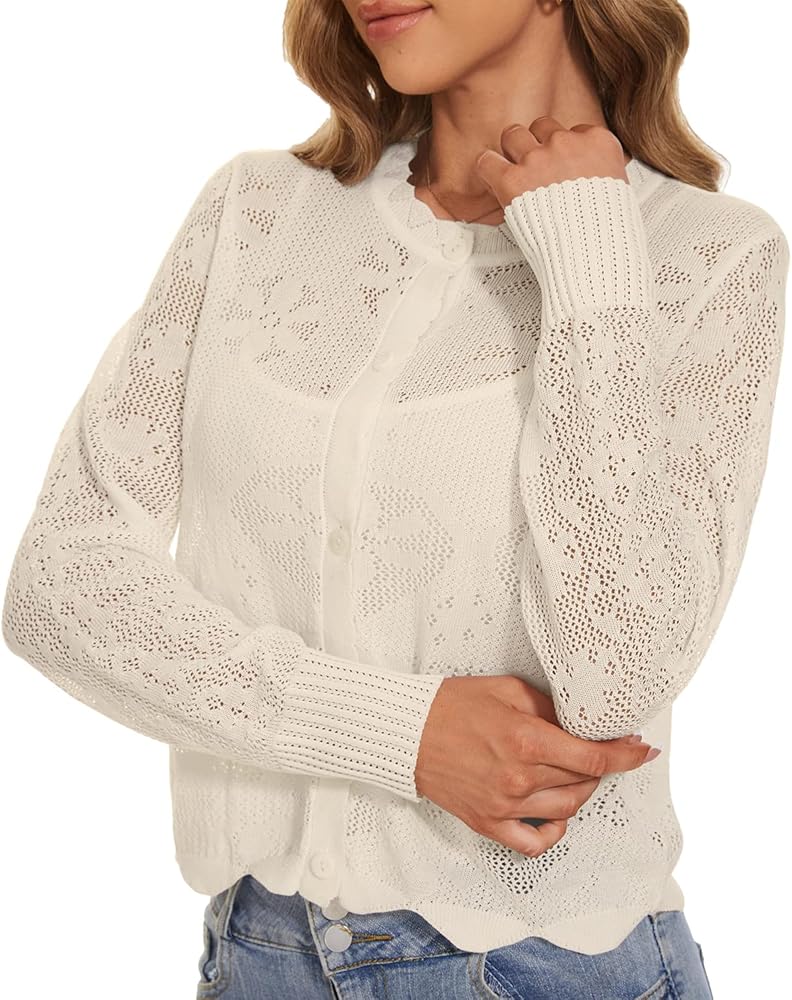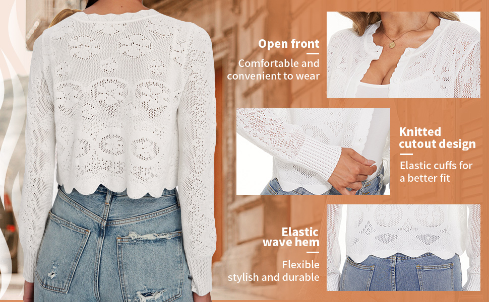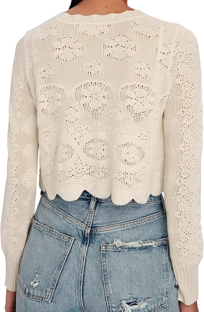 سترة صوفية ناعمة وخفيفة الوزن تتميز بأكمام طويلة، نمط كروشيه، أزرار سفلية، مجوفة للخارج، سترة صوفية قصيرة أنيقة لجميع المواسم