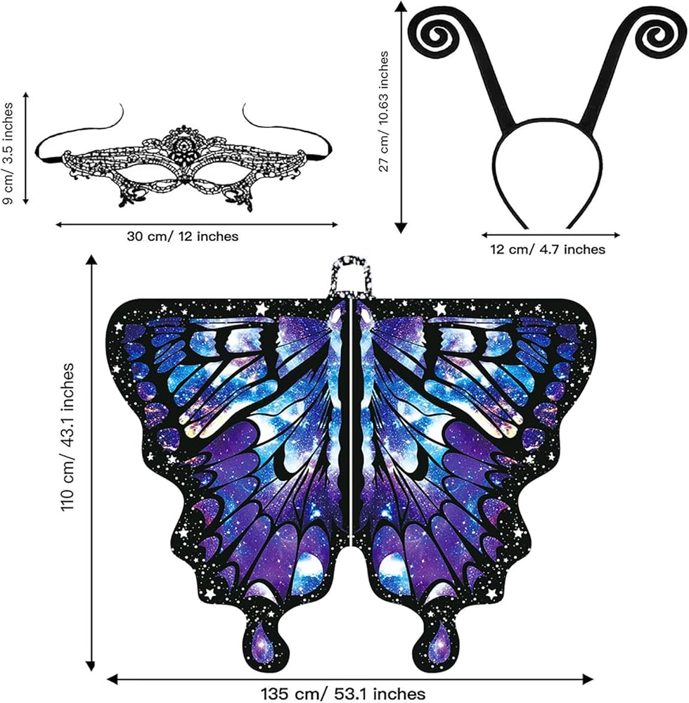 تصميم أنيق ومواد فاخرة: أقمشة طباعة على الوجهين، ناعمة، لا تبهت ومتينة، مما يجعلك بطل مأدبة رائعة حقًا، سوف تفوز بالكثير من الإطراء بالتأكيد. زي أجنحة الفراشة للبالغين والأطفال مصمم مثل الفراشة الحقيقية.