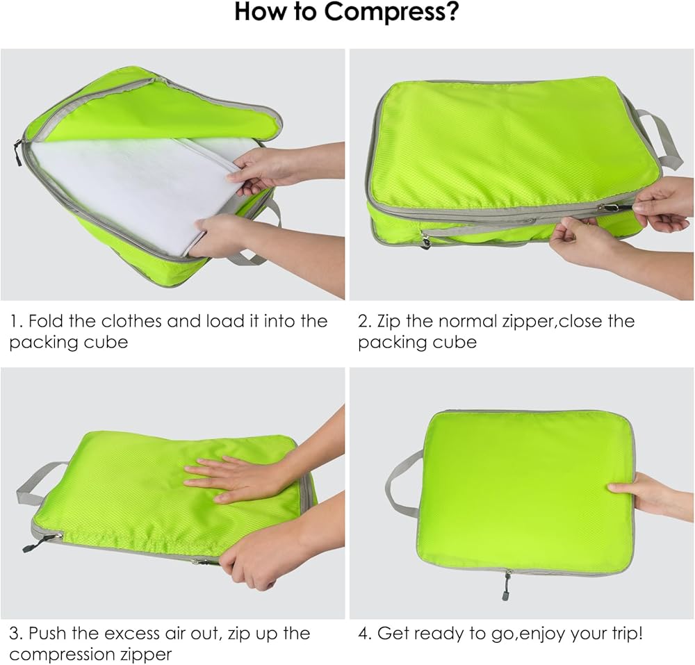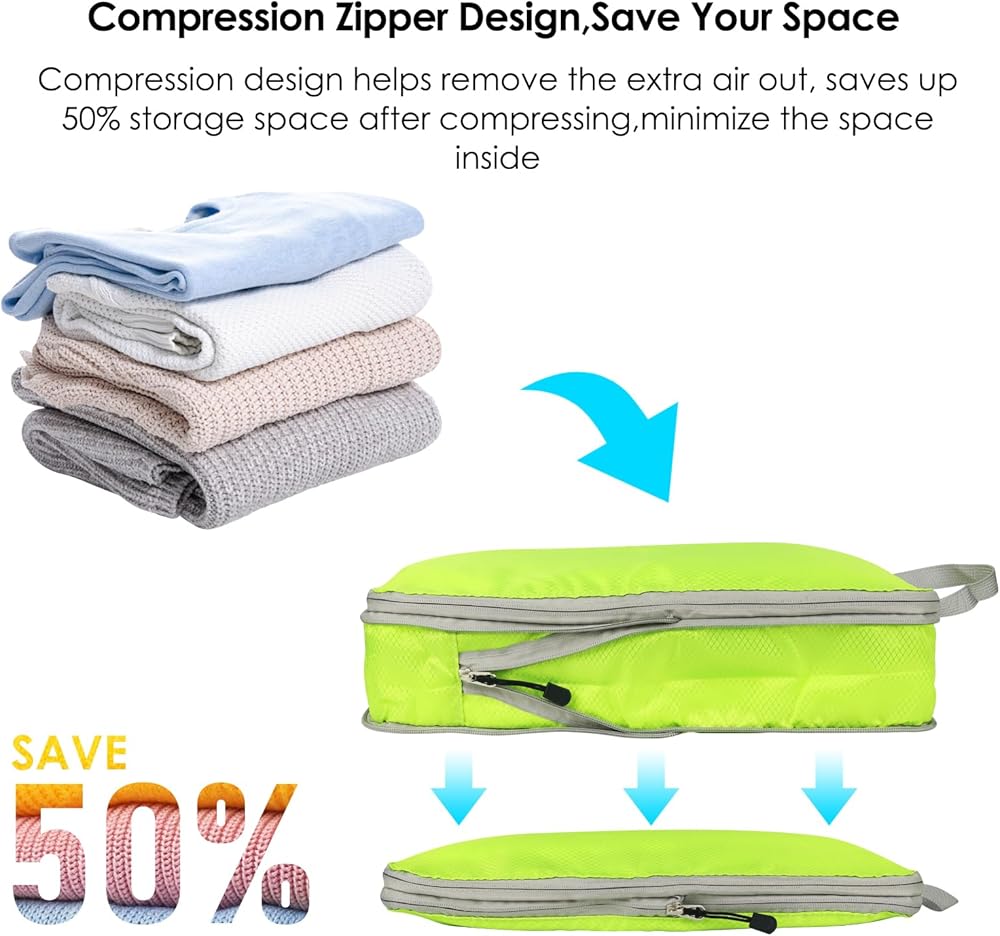 【تصميم مضغوط، موفر للمساحة】 يمكن ضغط مكعبات التعبئة المضغوطة الخاصة بنا مع سحاب ضغط إضافي لضغط المكعبات وتسطيحها، مثل مانع تسرب الهواء، وتقليل المساحة بالداخل. يمكنك ملؤها بأي شيء تريده، على الرغم من أن العناصر الأكثر شيوعًا هي الملابس والأحذية والاكسسوارات.