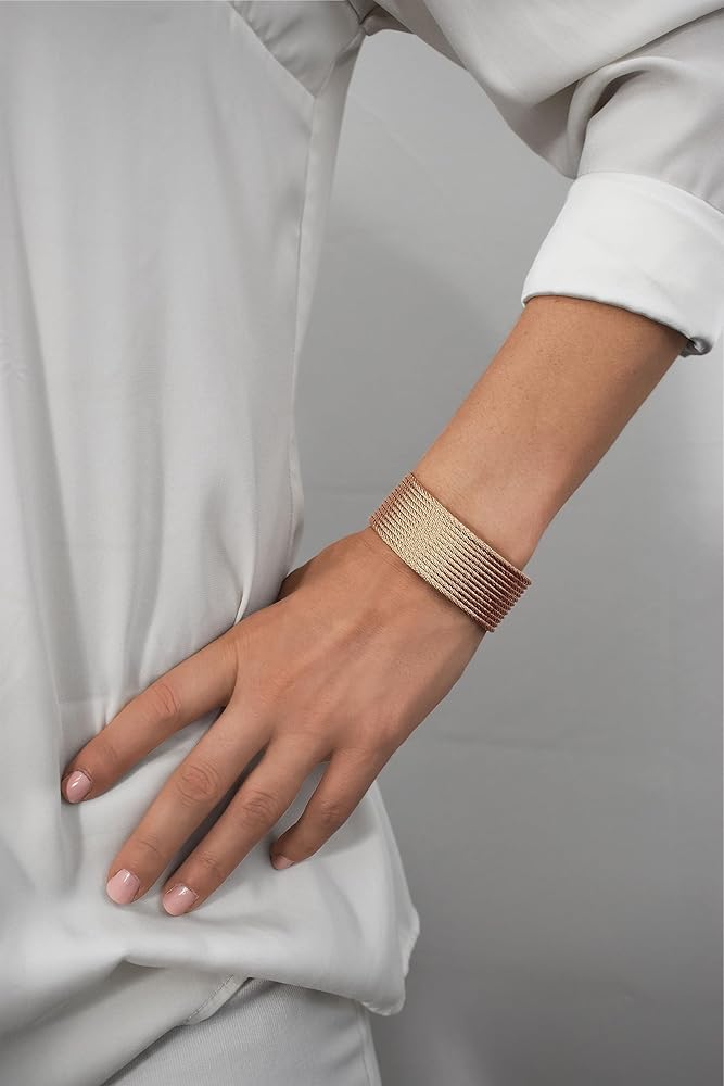 • خامة عالية الجودة: 12 صفًا من مجموعة Cuff Essentials. يجمع سوار الكفة الخاص بنا بين عناصر التصميم الحديثة والكلاسيكية والمواد عالية الجودة والحرفية. مصنوع من كابل متين من الفولاذ المقاوم للصدأ ملتوي إلى حد الكمال، مما يضيف ملمسًا وأبعادًا للحصول على مظهر عصري وعصري.