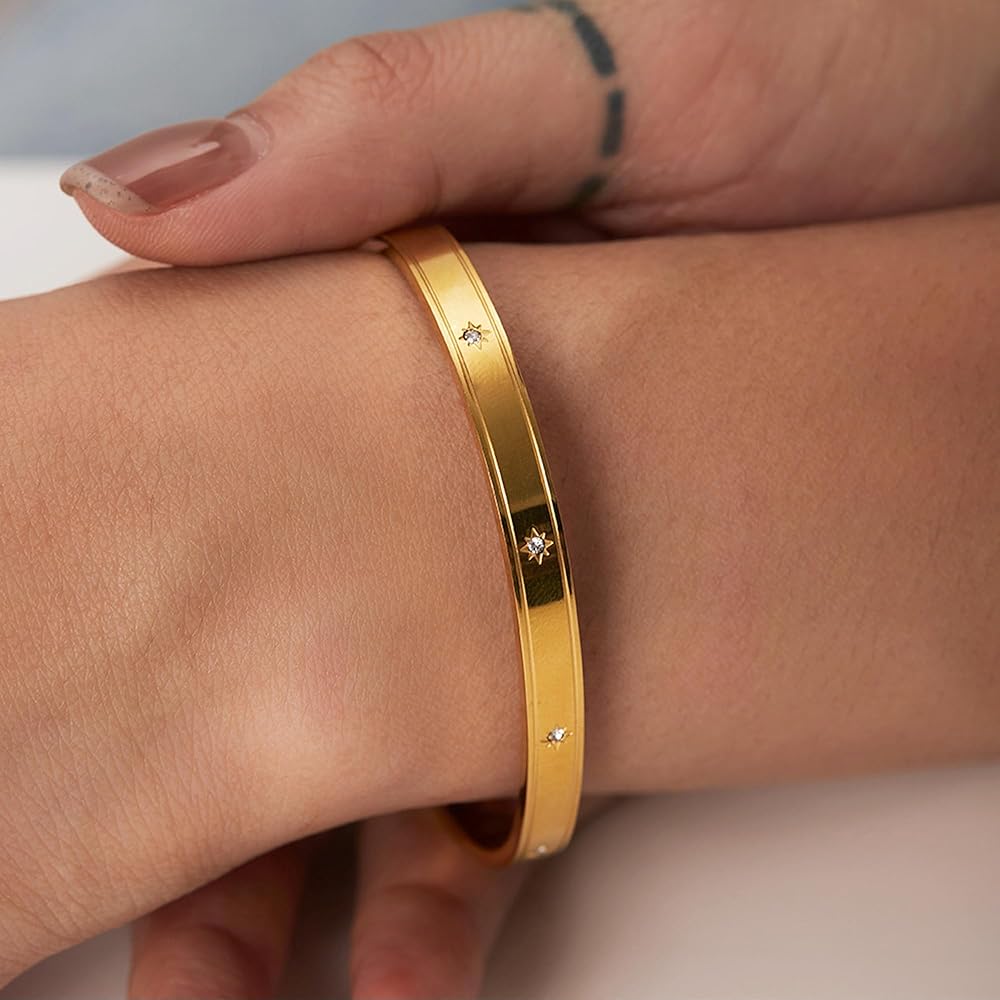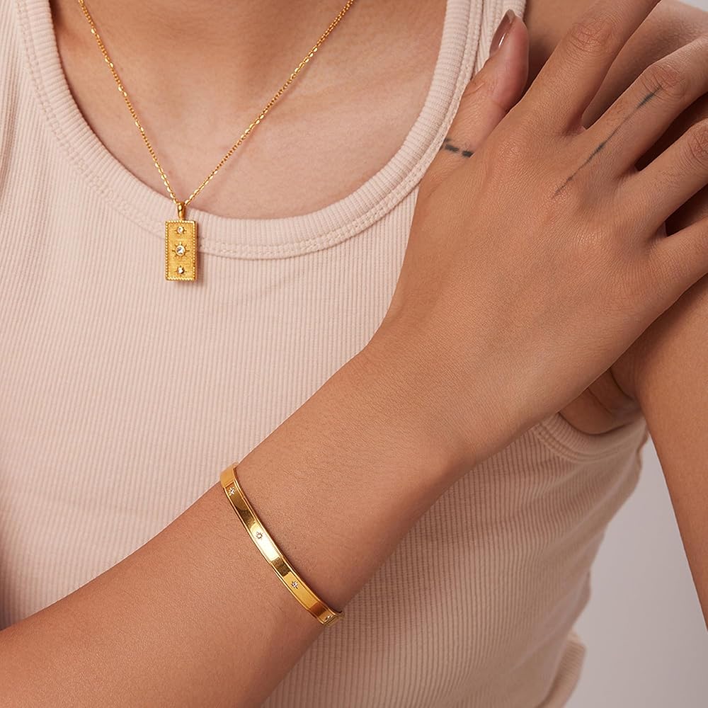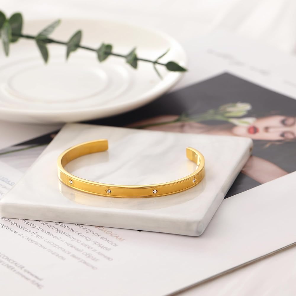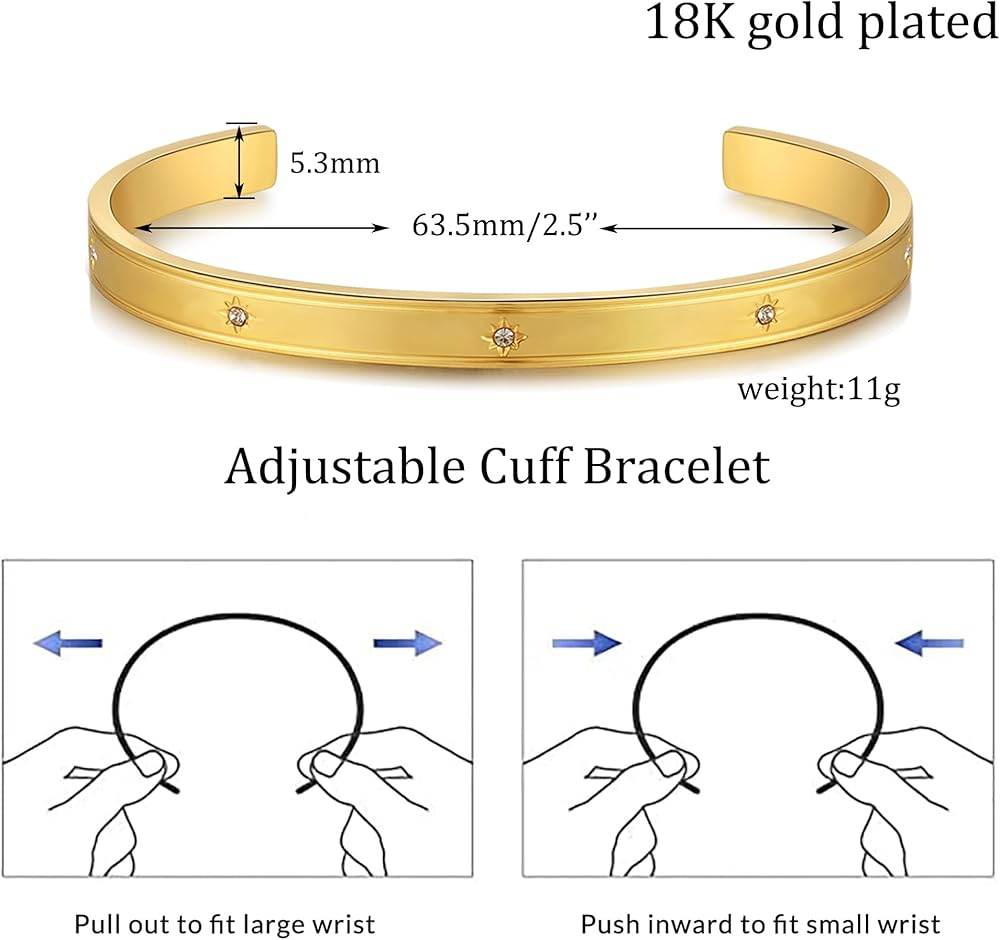 أساور الكفة النسائية: أساور الكفة البسيطة مطلية بالذهب عيار 14 قيراط مع الفولاذ المقاوم للصدأ وتتميز بأنها مصقولة للغاية وناعمة ولامعة وخالية من الرصاص والنيكل ولا تسبب الحساسية ولا تسبب ضررًا للبشرة.