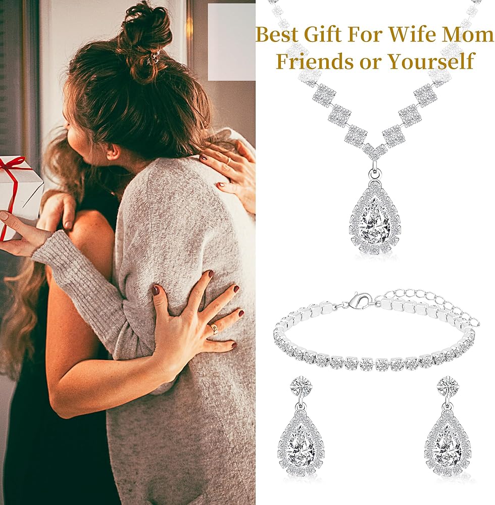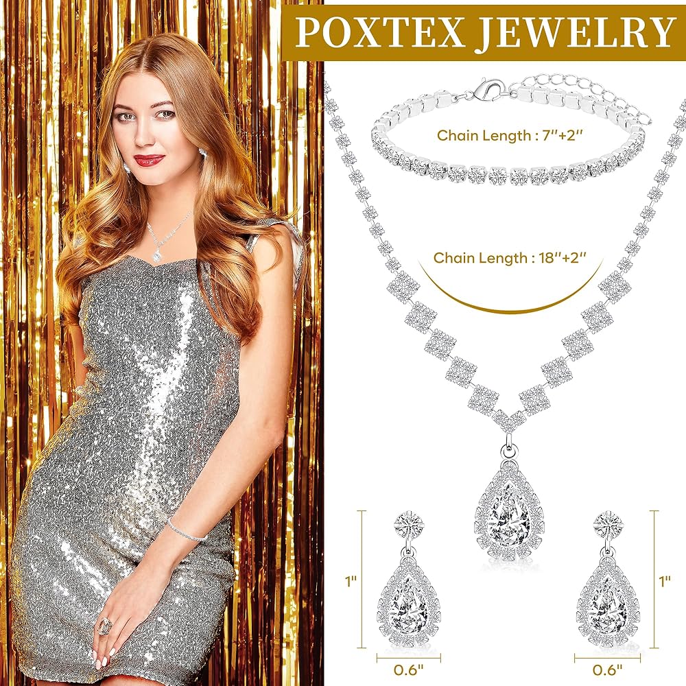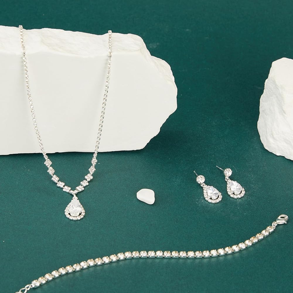 مجموعة مجوهرات فضية للعروس لحفلات الزفاف من بوكستكس، سوار تنس مرصع بالزركونيا المكعب لا يسبب الحساسية، طقم اقراط متدلية من حجر الراين على شكل دمعة، مجوهرات زفاف لحفلات الزفاف ووصيفة العروس والحفلات