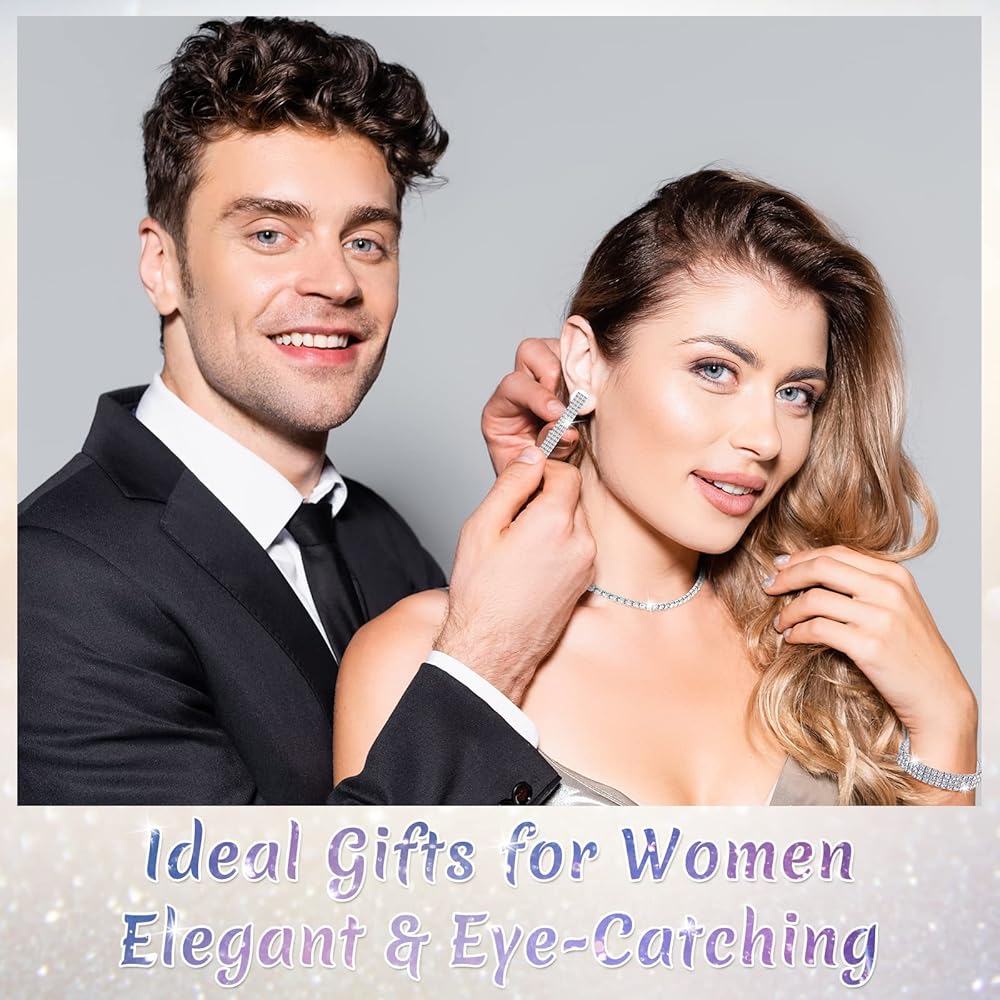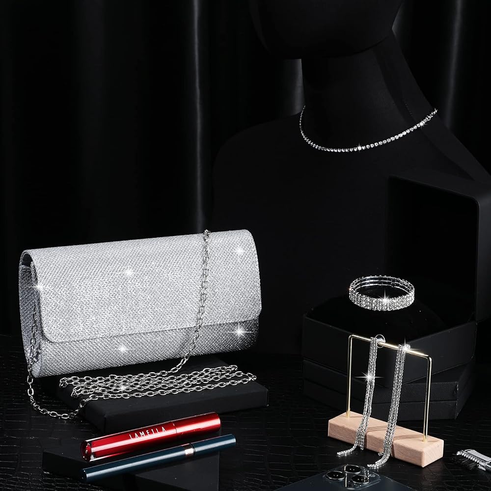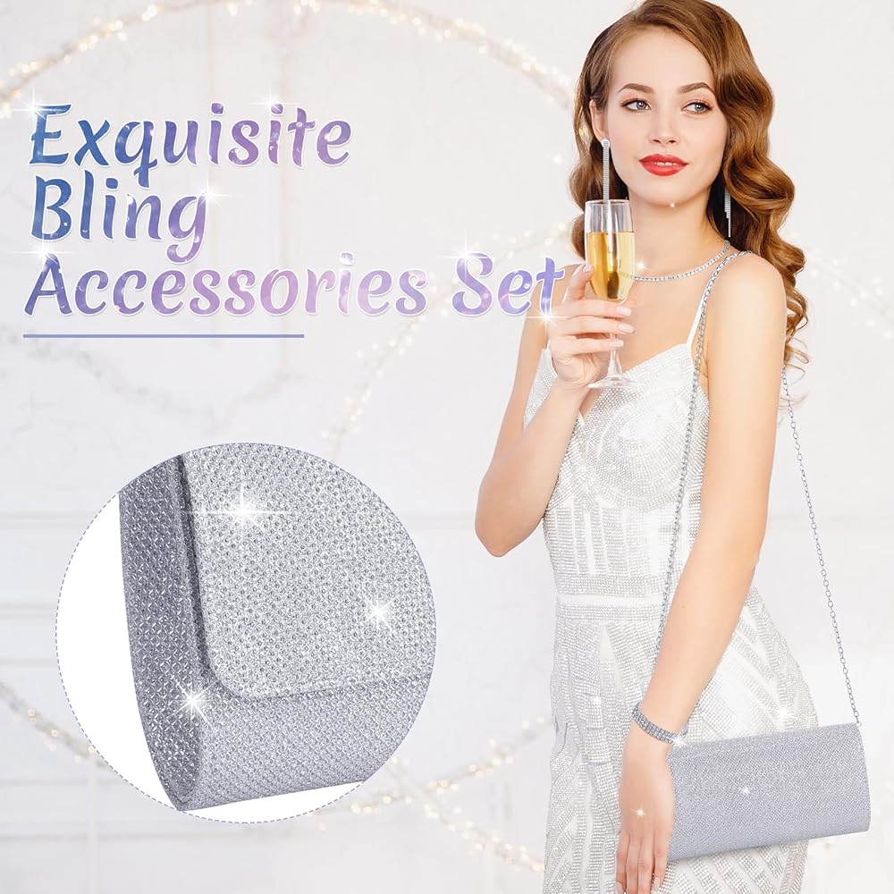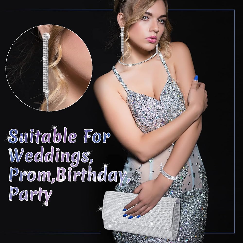 مجموعة إكسسوارات فضية من حجر الراين: سوف تحصل على قطعة واحدة من محفظة القابض، وقطعة واحدة من القلادة، وزوج واحد من الأقراط، وقطعة واحدة من السوار، لطيفة للحفلات المسائية، وحفلات الرقص، وحفلات التخرج، وحفلات الزفاف، وحفلات عيد الميلاد أو غيرها من المناسبات الرسمية