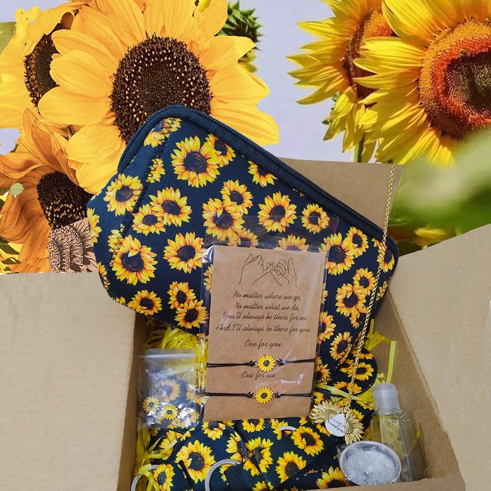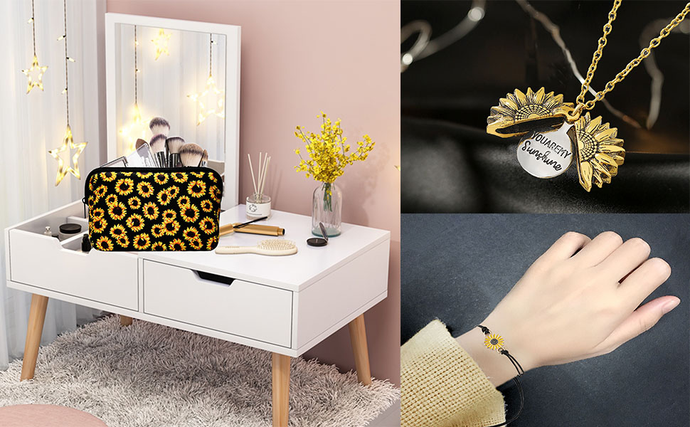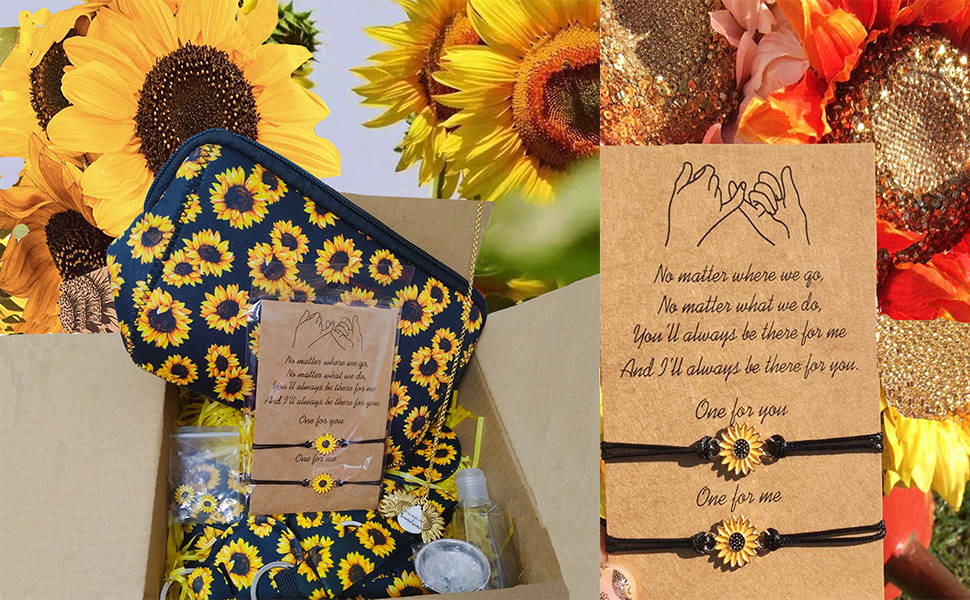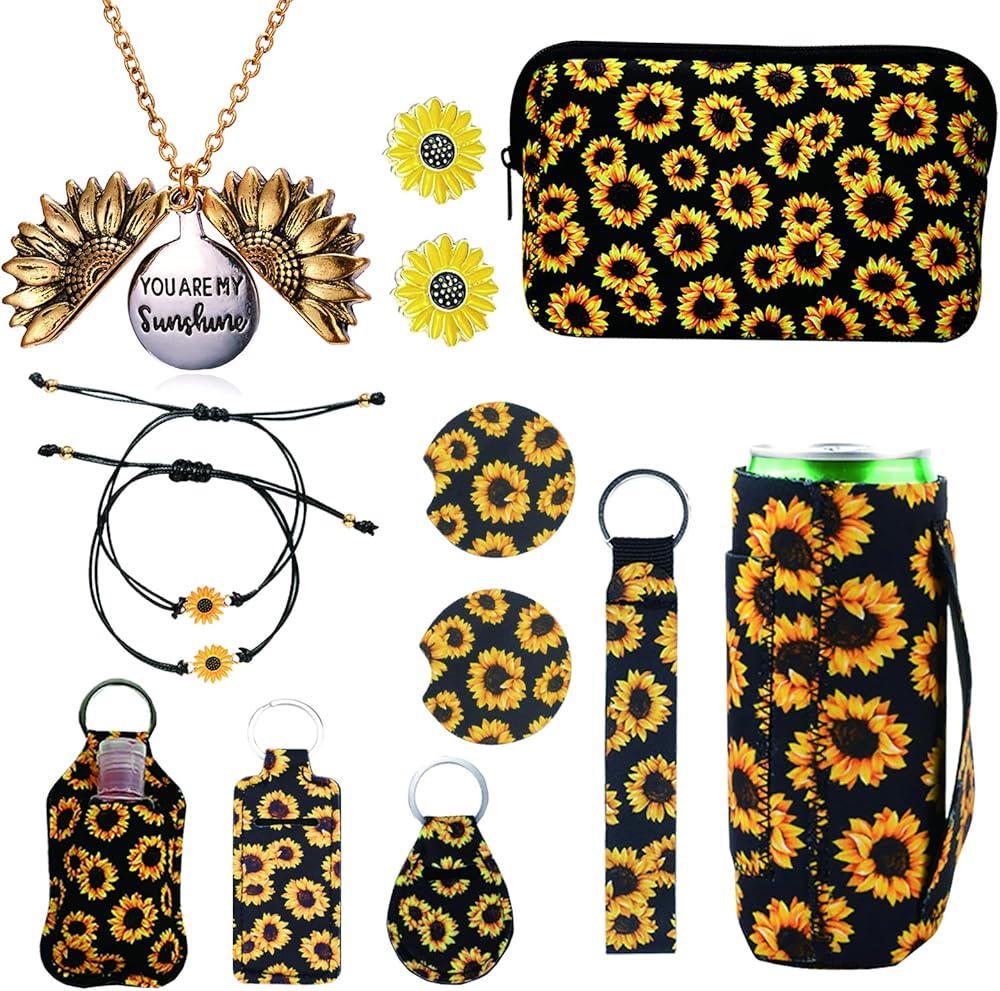 • Value Sunflower Gift Box Set - Including 1 x Sunflower Necklace,2 x Sunflower Bracelet,2 x Sunflower Earrings,1 x Sunflower Makeup Bag 1 x Sunflower Lipstick Holder,1 x Sunflower Wristlet,1 x Hand Sanitizer Holder Keychain,1 x Sunflower Slim Can Holder,2 x Sunflower Car Coaster;Our "You Are My Sunshine" Sunflower Gift Box are the cutest way to send someone a box full of sunshine, there is no better way to say I care about yo.