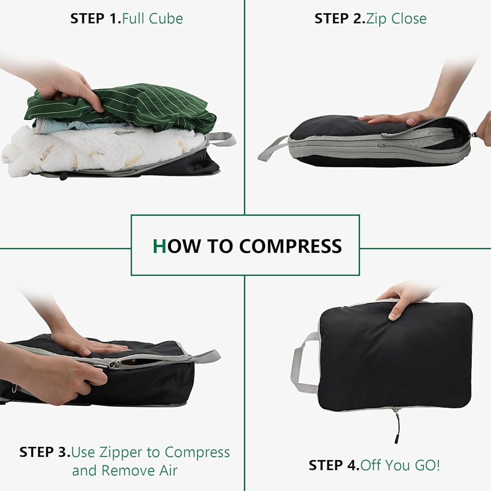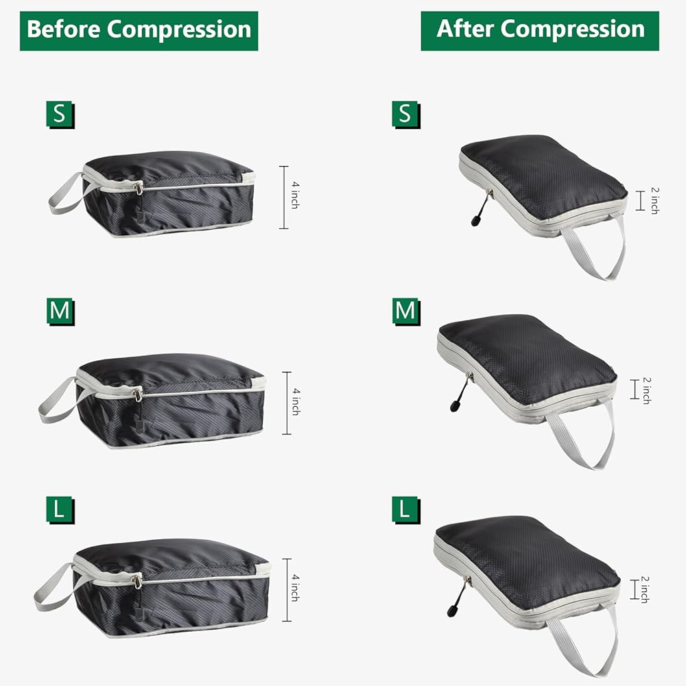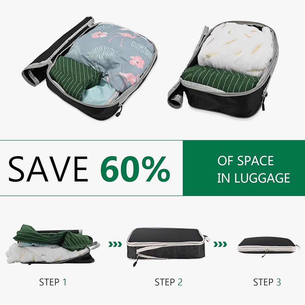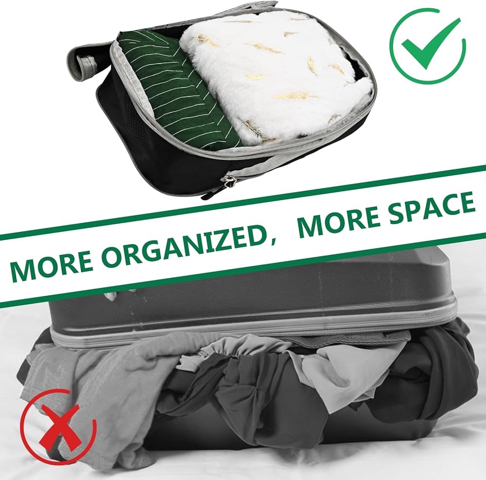 【توفير مساحة مكعبات التعبئة】يساعد تصميم ضغط مكعبات التعبئة على إزالة الهواء الزائد، مما يوفر 50% من مساحة التخزين بعد الضغط. مما يجعل التعبئة سهلة ويقلل المساحة المطلوبة للسفر بشكل كبير. لا مزيد من التعبئة والتغليف. يمكن للسحّابات المزدوجة لحقائب الضغط للسفر أن تضغط الملابس بشكل مثالي، مما يساعد على توفير مساحة لحمل الأمتعة أو حقائب الظهر. معدات سفر ممتازة تقلل من كمية العناصر التي تحملها معك
