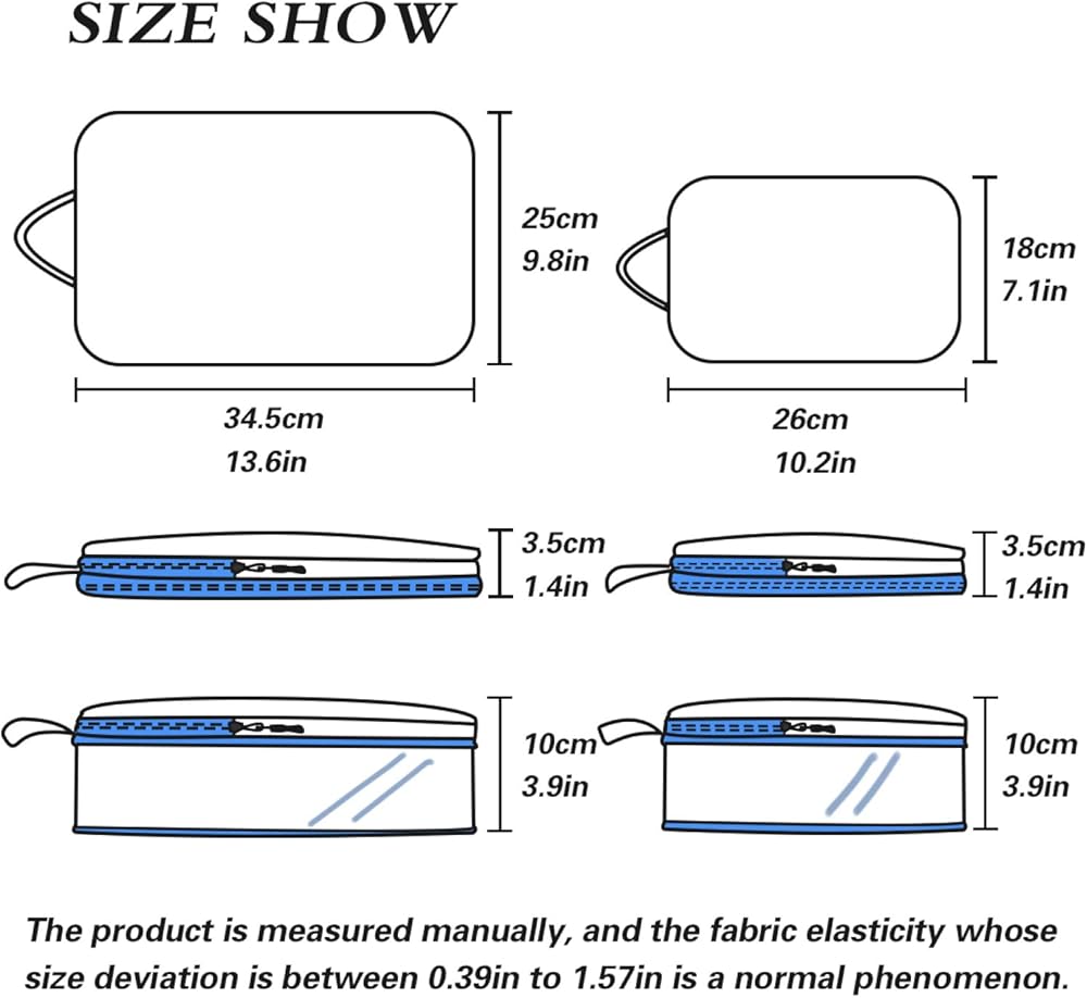3. أحجام مختلفة قابلة للتنفس لتناسب جميع احتياجات السفر الخاصة بك في حقيبة السفر والملابس والأحذية وأدوات النظافة، افصل أغراضك عن كل حقيبة للحفاظ على نظافة الحقيبة ومرتبة.