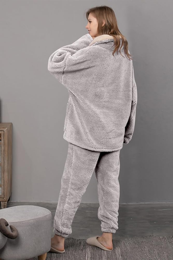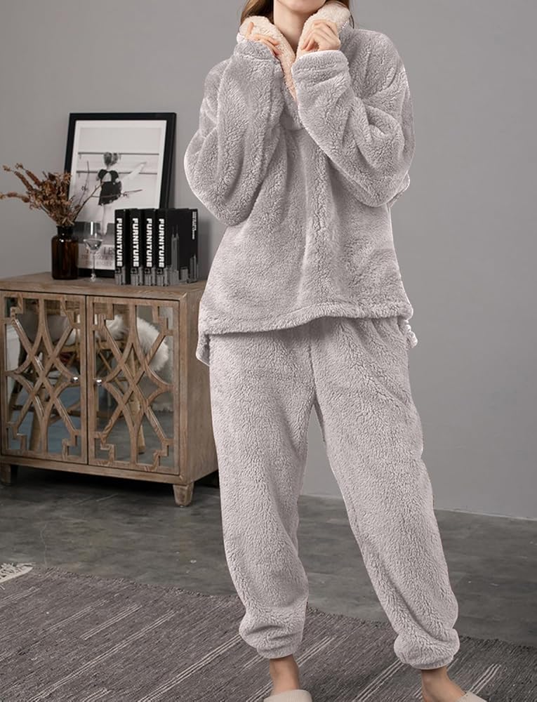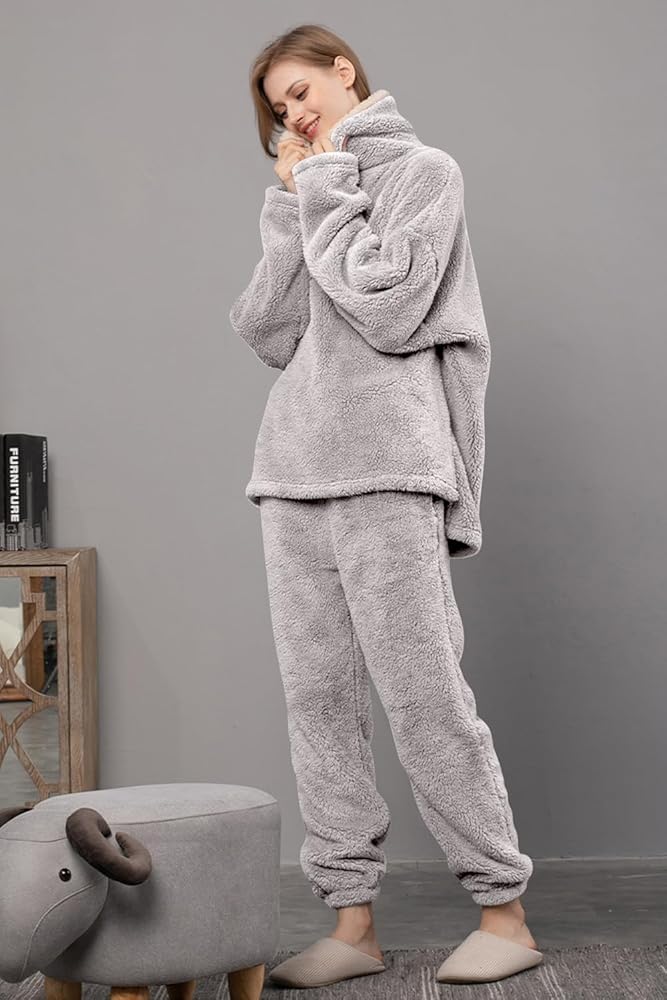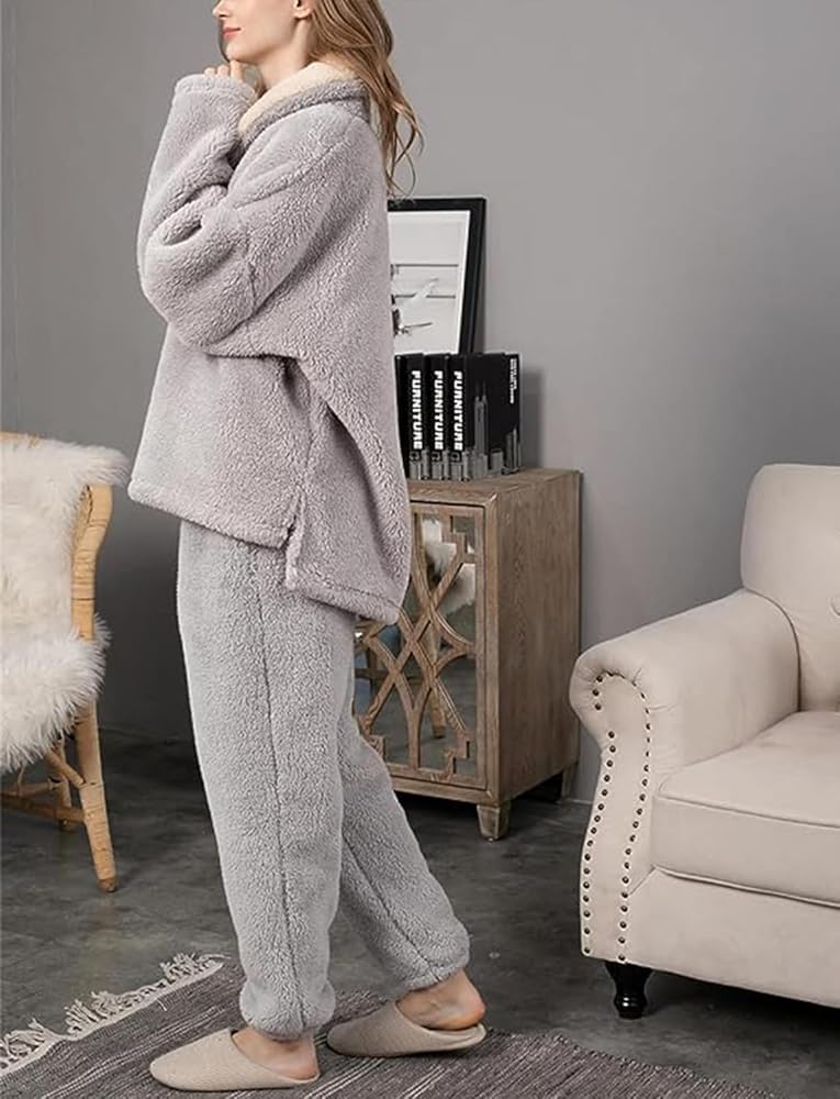 ❀الخيار الأفضل للشتاء: ملابس مريحة من صوف الشيربا اللطيفة للسيدات، أكمام طويلة، رباط، بلوفر ومرن عالي الخصر، سراويل بيجامة ناعمة غامقة مع جيوب، لون كلاسيكي ثابت، ببساطة، أنيقة وعصرية، توفر لك مظهرًا دافئًا وعصريًا طقس بارد. طراز فضفاض، يضيف لمسة شبابية لك، حر وساحر. والأسلوب البسيط لن يصبح قديمًا أبدًا!