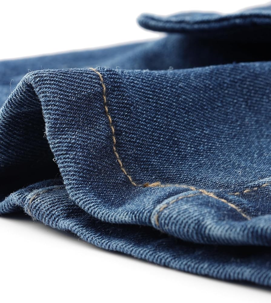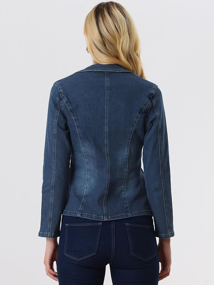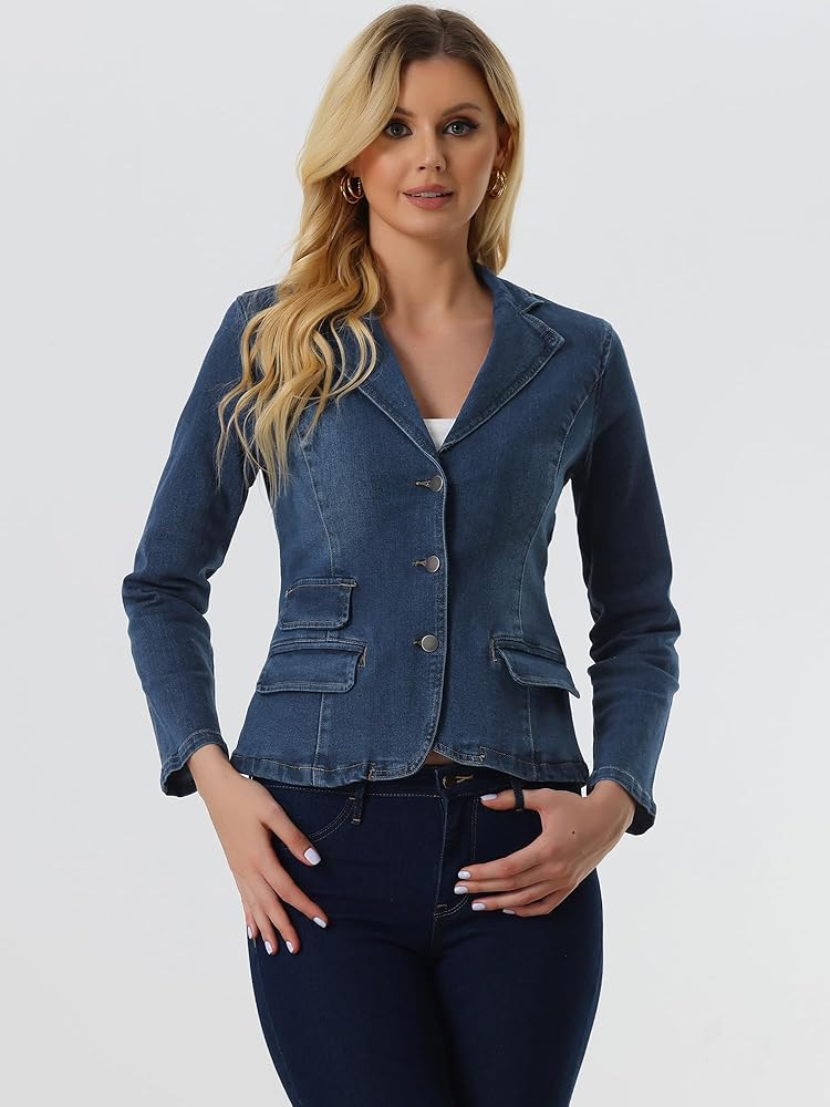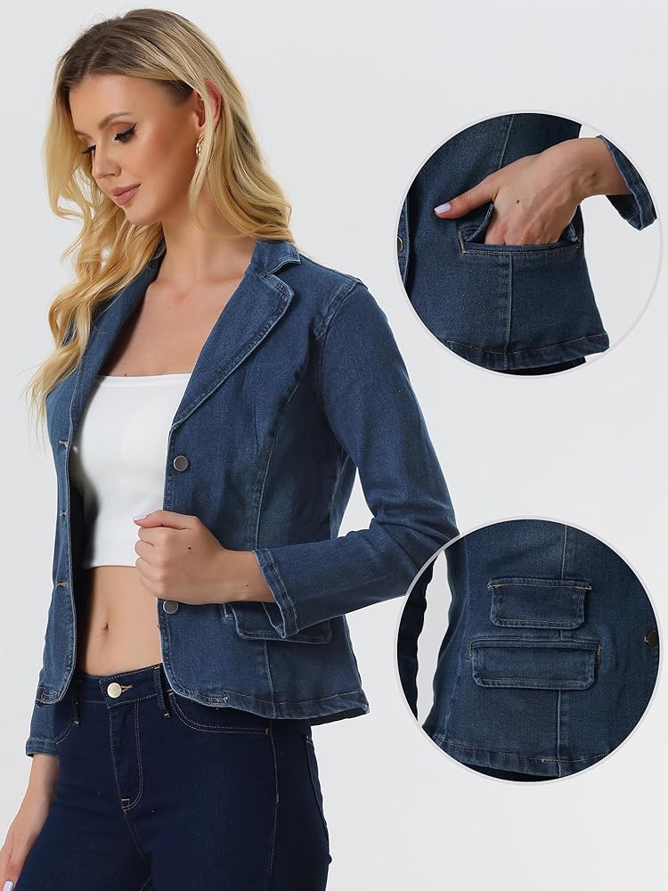 تتكون سترة الجينز الكلاسيكية هذه من عدة نقاط تصميم: ياقة طية صدر مدببة، وأكمام طويلة، وأزرار سفلية، وجيبين بغطاء، وخصر مشدود