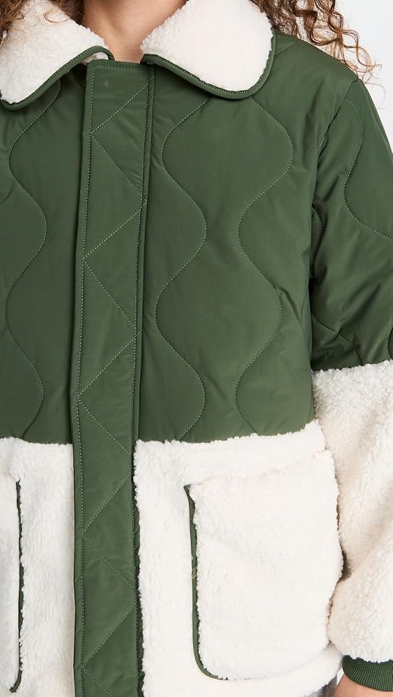 زخرفة من الصوف، أكمام طويلة مع أطراف أكمام محاكة مضلعة، غطاء كبس وفتحة بسحاب مخفي، خط عنق بياقة