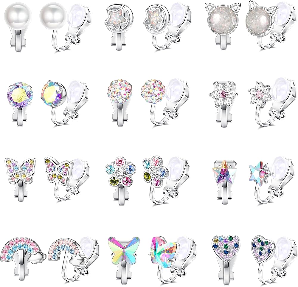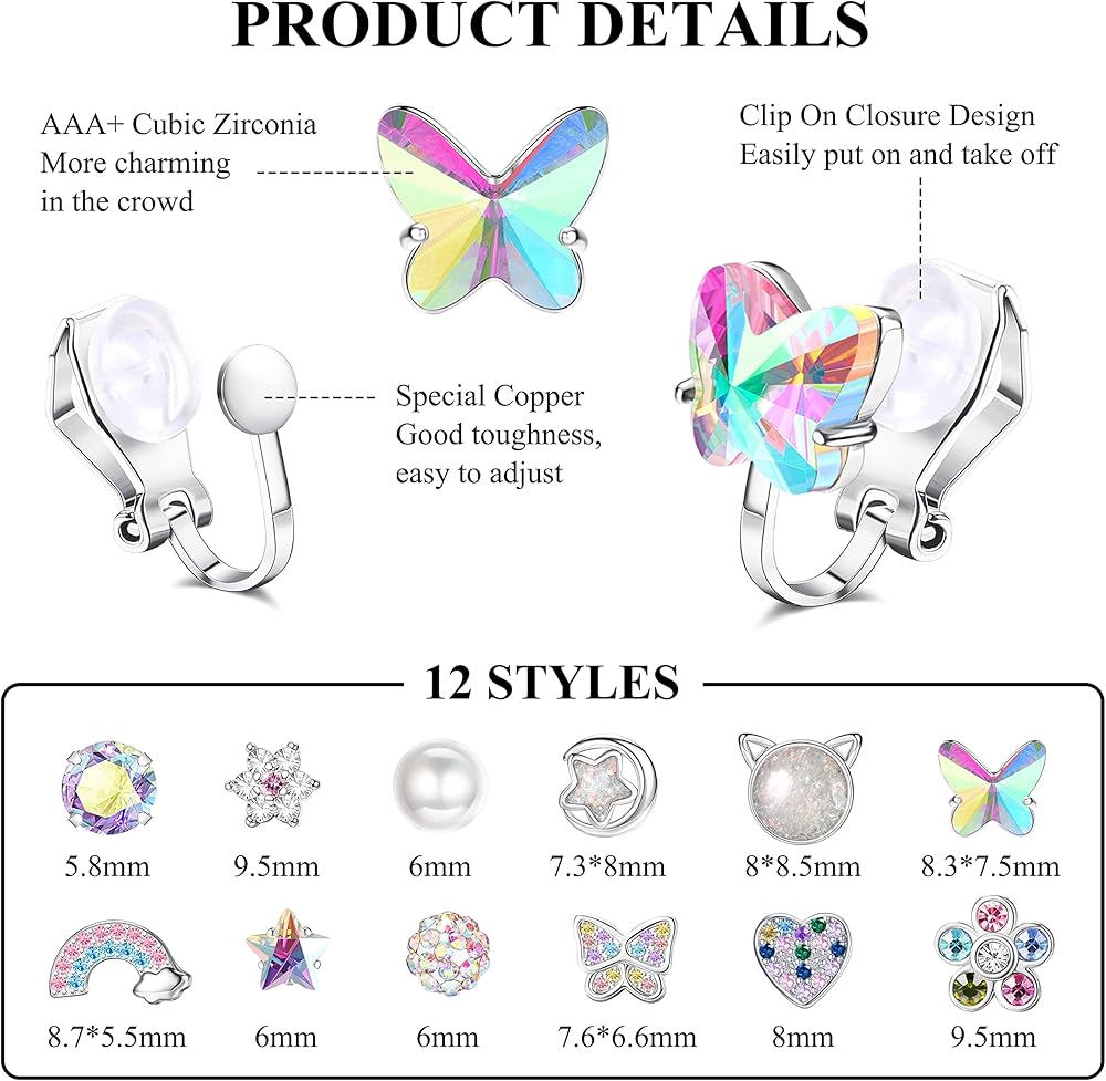 كاسيكا 12 زوج من الاقراط بمشبك للنساء والفتيات، لا تسبب الحساسية، اقراط لطيفة على شكل فراشة وزهور ولؤلؤ وقوس قزح، اقراط للنساء متعددة الالوان غير مثقوبة، معدن زركونيا مكعب, معدن, مكعب زركونيا