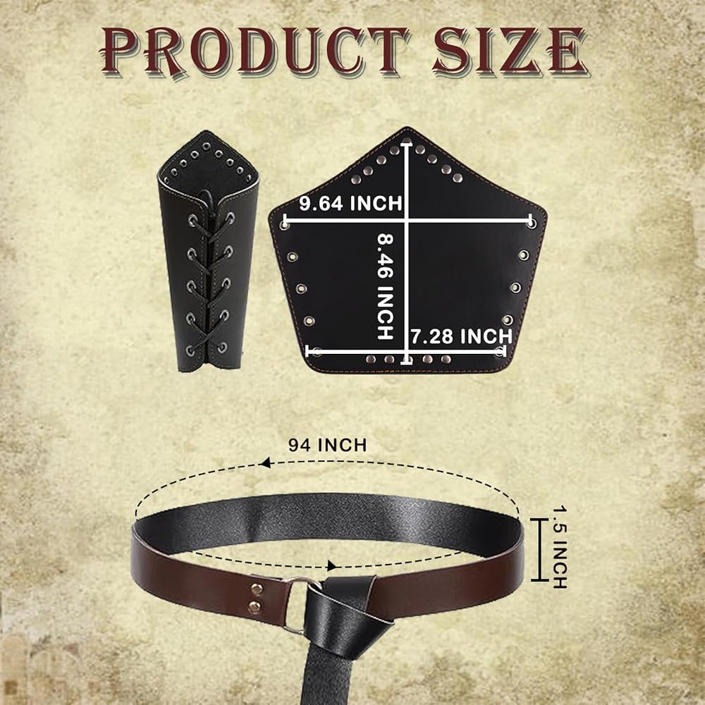 مجموعة بنية مكونة من 8 قطع: وشاح شال بني *1، حزام كتف واحد من جلد البولي يوريثان *1، حزام خصر من جلد البولي يوريثان لعصر النهضة في العصور الوسطى *1، دعامة قوطي من جلد البولي يوريثان *2، ضفدع سيف العصور الوسطى *1، زجاجة جرعة من الفلين السحري الداكن *1، غطاء جلدي للزجاجة*2، دبوس أمان*2.