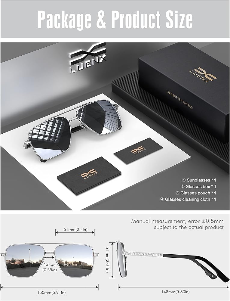 [عبوة هدايا ودعم مدى الحياة] ▶ تتضمن النظارات الشمسية*1 / حقيبة النظارات الناعمة*1 / قطعة قماش النظارات*1 / كرتون التغليف*1. يتمتع جميع عملاء LUENX بضمان استرداد الأموال لمدة 30 يومًا؛ وهذا يتماشى مع الدعم مدى الحياة! فقط أرسل لنا رسالة عبر أمازون.