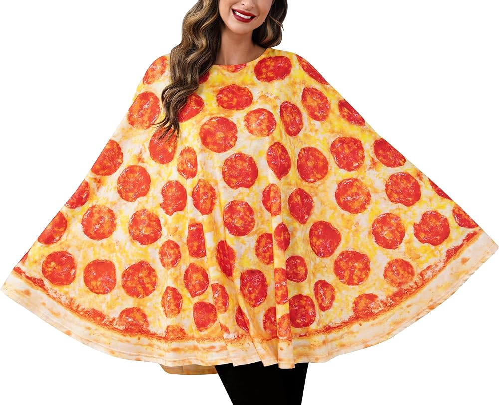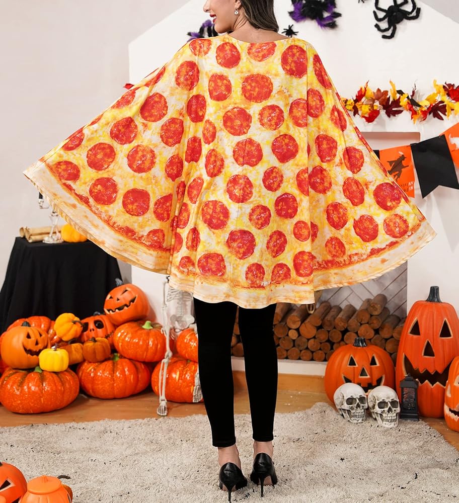 معطف الهالوين - تقنية الطباعة الواقعية تجعل هذا الرداء يبدو أشبه بالبيتزا الحقيقية! الجزء الأمامي من هذا الزي يشبه شريحة من البيتزا، كاملة مع الجبن والفلفل.