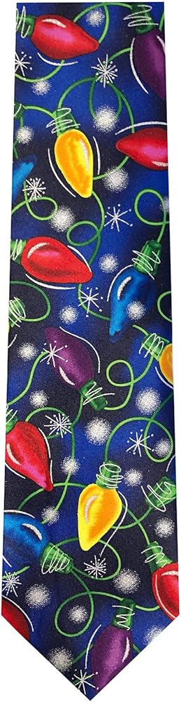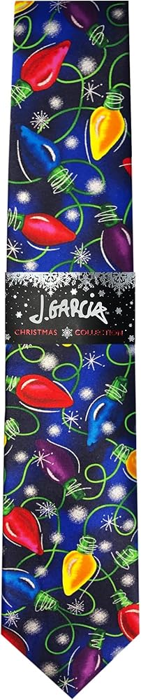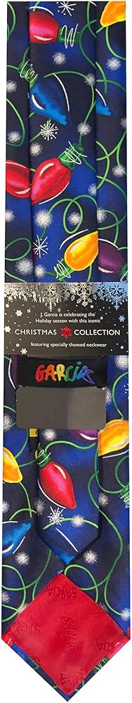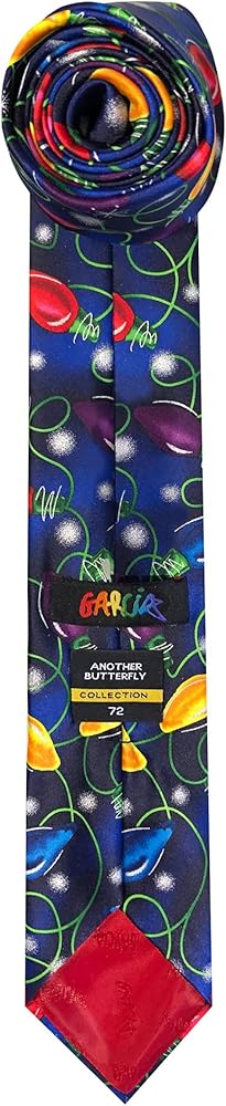 تتميز ربطة العنق الرجالية من Jerry Garcia برسومات لمصابيح عيد الميلاد الكلاسيكية الملونة باللون الأحمر والأرجواني والأصفر والأزرق على قواعد خضراء وسلك مع ندفات ثلج بيضاء على خلفية زرقاء داكنة. بعنوان مجموعة فراشة أخرى 72. جزء من مجموعة عيد ميلاد سعيد.