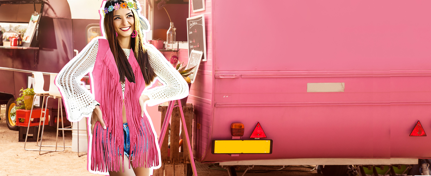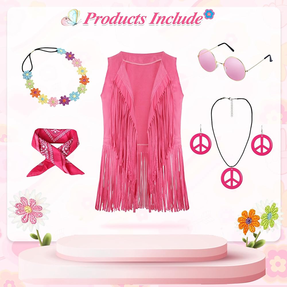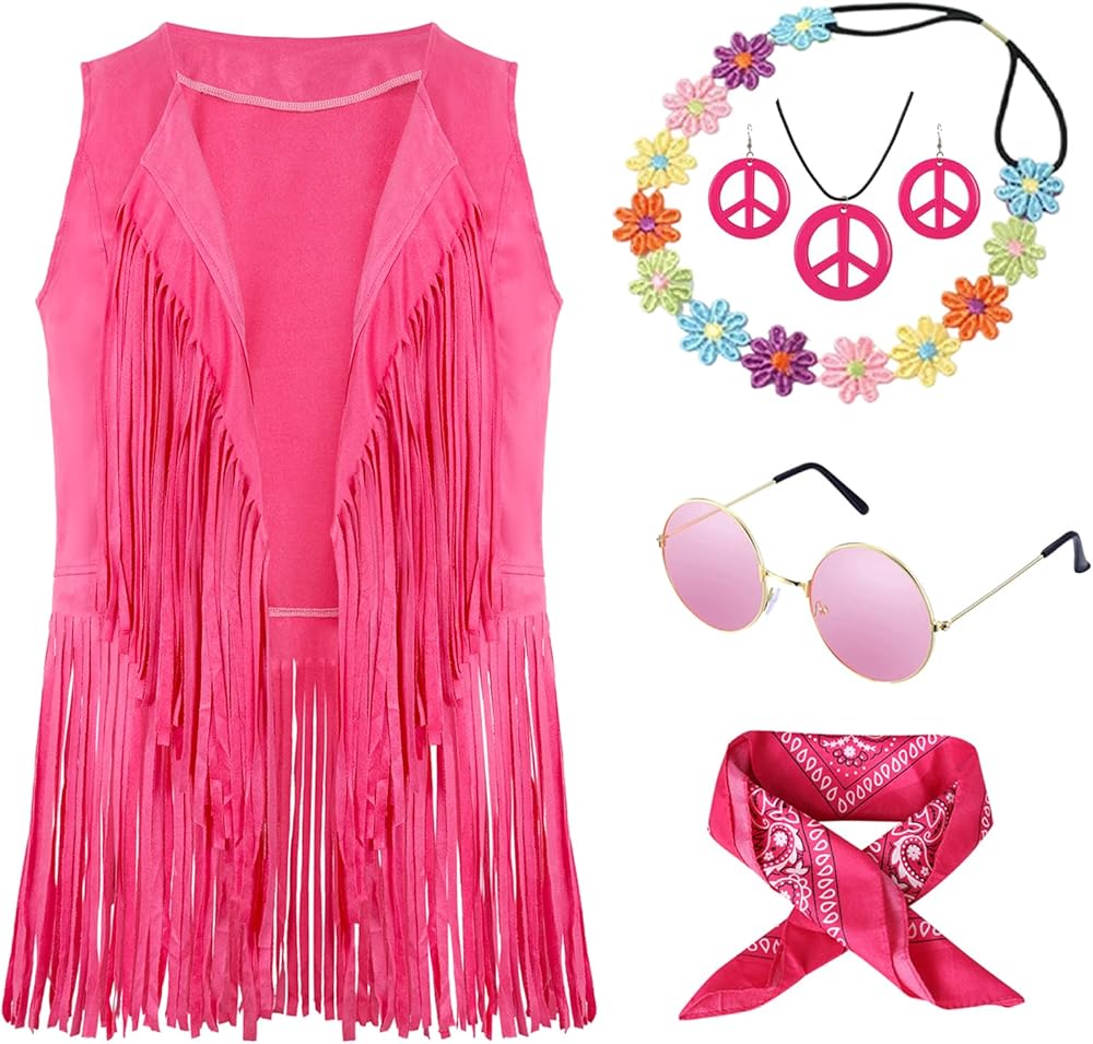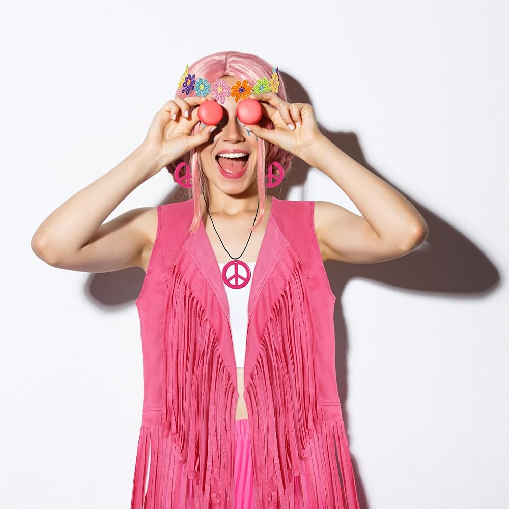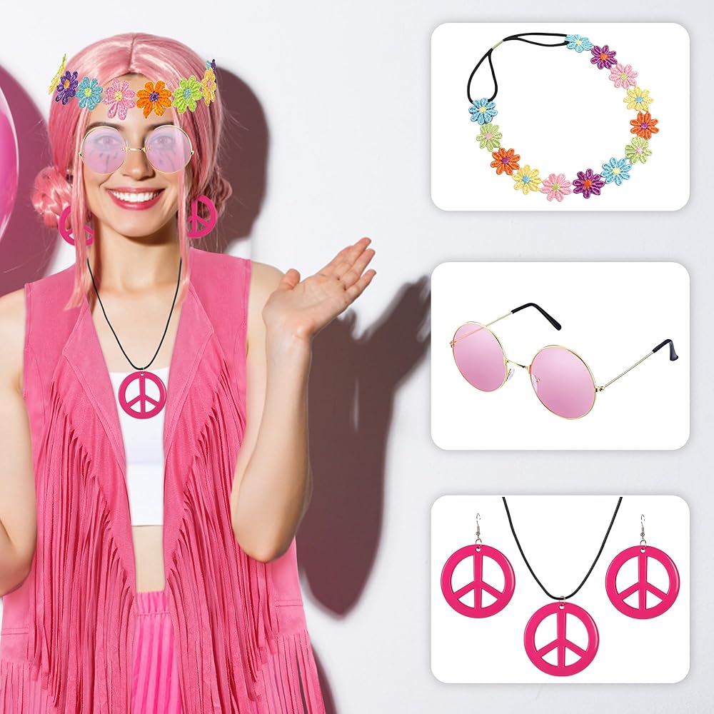 • Pink Hippie costume package includes: 1 piece sleeveless vest cardigan, 1 pair of pink peace sign earrings, 1 piece of necklace ,1 piece flower headband and 1 pair of pink retro sunglasses.