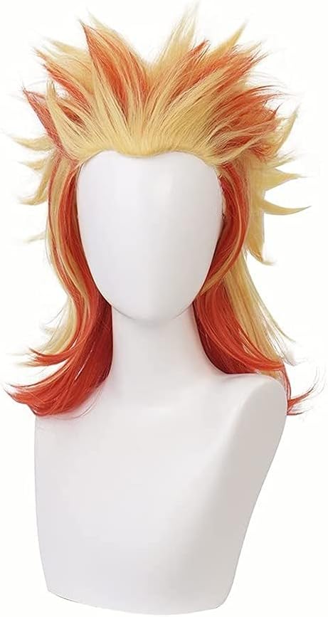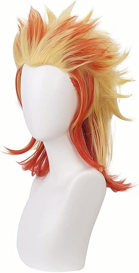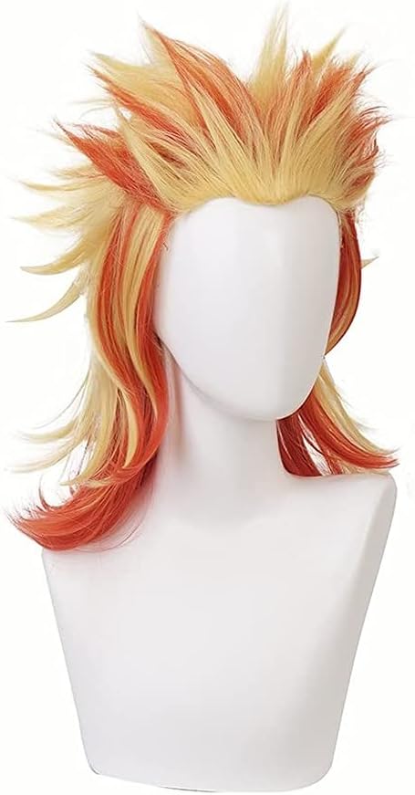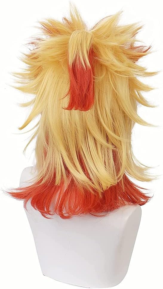 Liamiona Rengoku Kyoujurou شعر مستعار تأثيري أنيمي أحمر أصفر قصير مجعد مقاومة للحرارة الشعر هالوين ملابس تنكرية للحفلات شعر مستعار + غطاء شعر مستعار مجاني