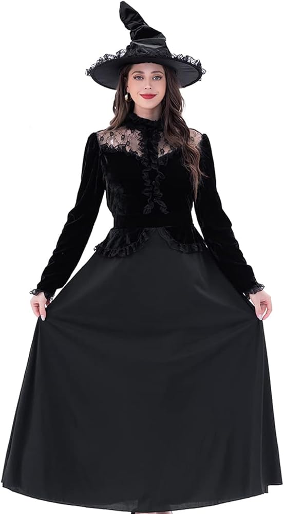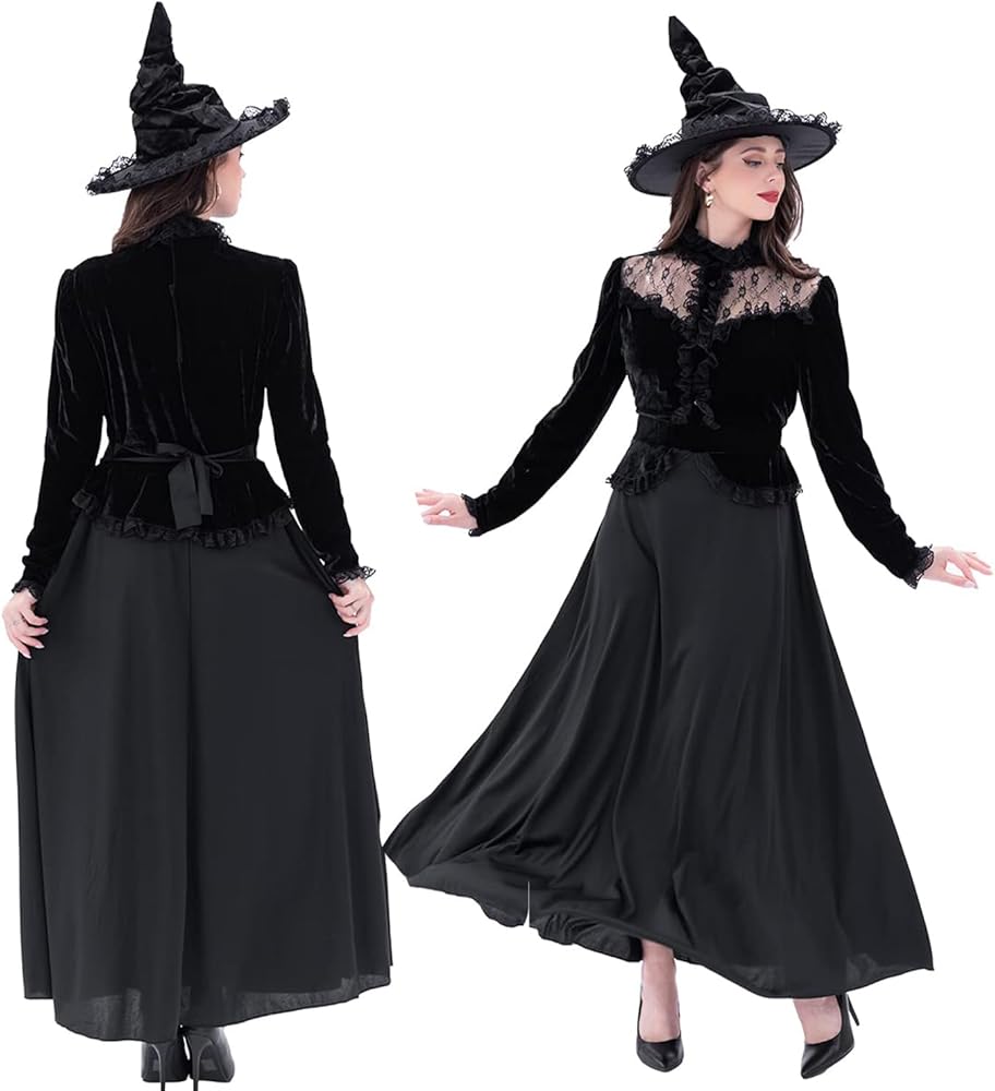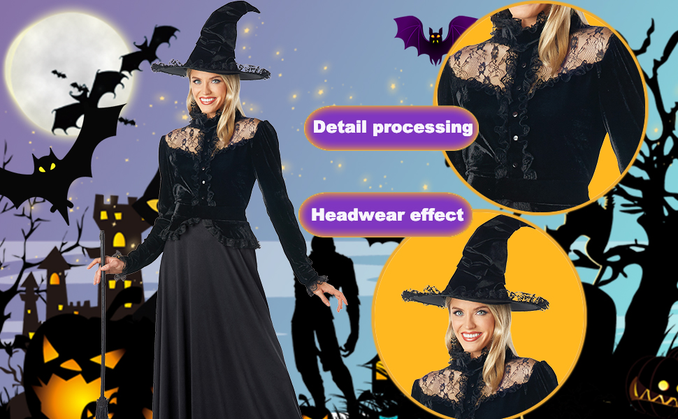 🎃تصميم فريد: الأكتاف الطويلة لزي الساحرة، وحافة القبعة وأساور الأكمام مصممة بدانتيل شفاف، مما يضيف القليل من الجو الساحر