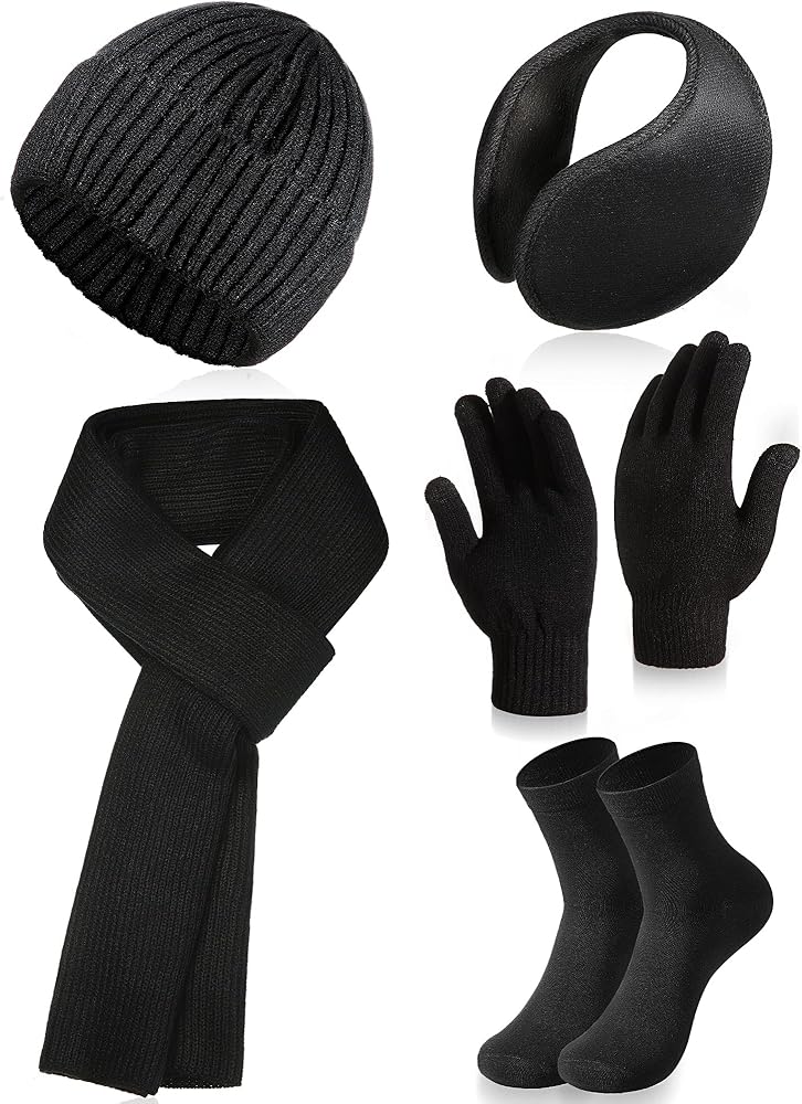 قبعة صغيرة شتوية للرجال مكونة من 5 قطع، قبعة محبوكة على شكل جمجمة ووشاح لتدفئة الرقبة وقفازات تعمل باللمس، مجموعة جوارب للصديق، الرجال، المراهقين، اسود، مقاس واحد, أسود, مقاس واحد
