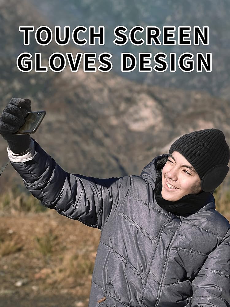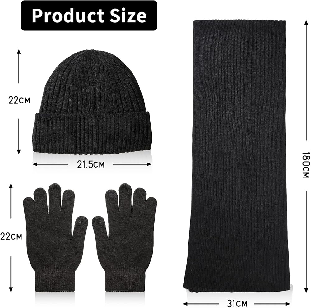 طقم الشتاء الخاص بنا مصنوع من قماش محبوك ناعم، مريح ومريح، كما يمكن تمديد القبعة الصغيرة المحبوكة والقفازات التي تعمل باللمس، مقاس واحد يناسب معظم الرجال والنساء.
