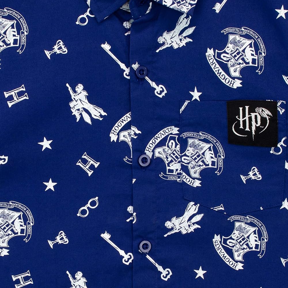 الأولاد قميص هاري بوتر. الومورا! أطلق العنان للأنماط الأكثر تهجئة في هذا القميص السحري ذو الأزرار السفلية! يتميز هذا القميص ذو الأكمام القصيرة باللون الأزرق الساحر بنمط شامل من زخارف هاري بوتر بما في ذلك شعار هوجورتس ونظارات هاري والمفاتيح والنجوم وكأس الكأس - كل شيء ضروري لسنة المغامرة في هوجورتس! يكتمل هذا التي شيرت العصري بياقة ذكية وشعار هاري بوتر على جيب الصدر، وسيُصقل ساحرك الرائع في وقت قصير - مثالي للمآدب الاحتفالية في القاعة الكبرى!