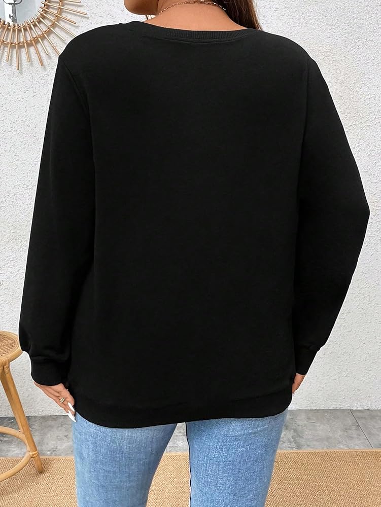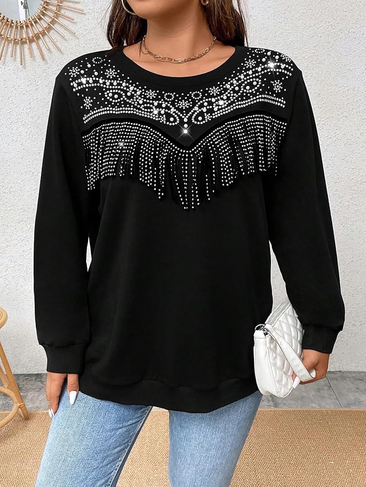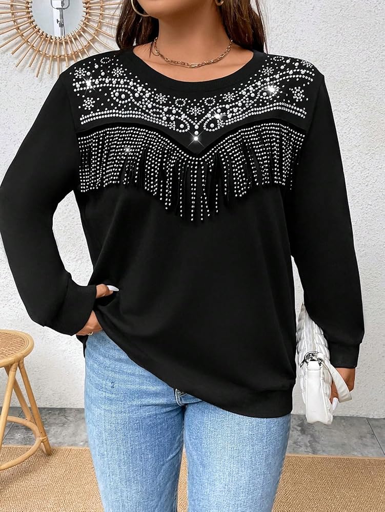 سويت شيرت نسائي من WDIRARA مقاس كبير مزين بحجر الراين ومزين بالخرز وياقة دائرية وأكمام طويلة