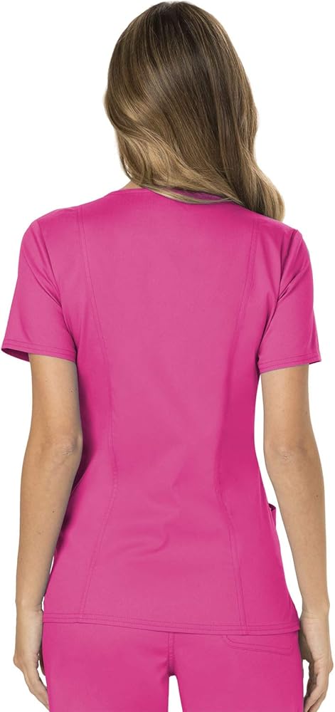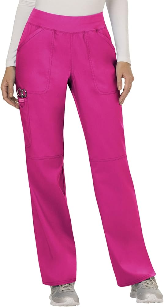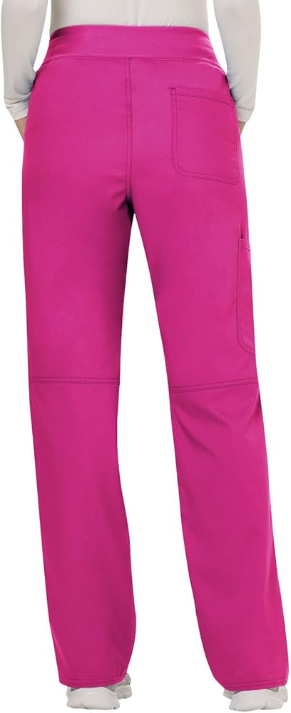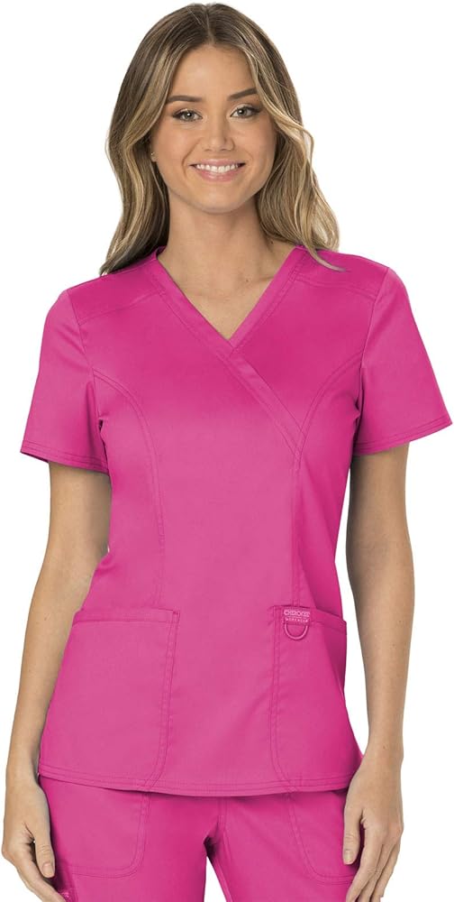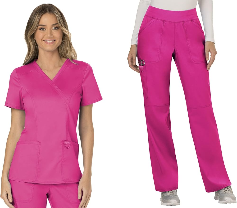 مجموعة ملابس العمل النسائية من Cherokee Revolution WW610 Mock Wrap Top & WW110 منتصف الارتفاع مستقيم الساق سحب على بانت، وردي كهربائي - XS Top / XS Pant