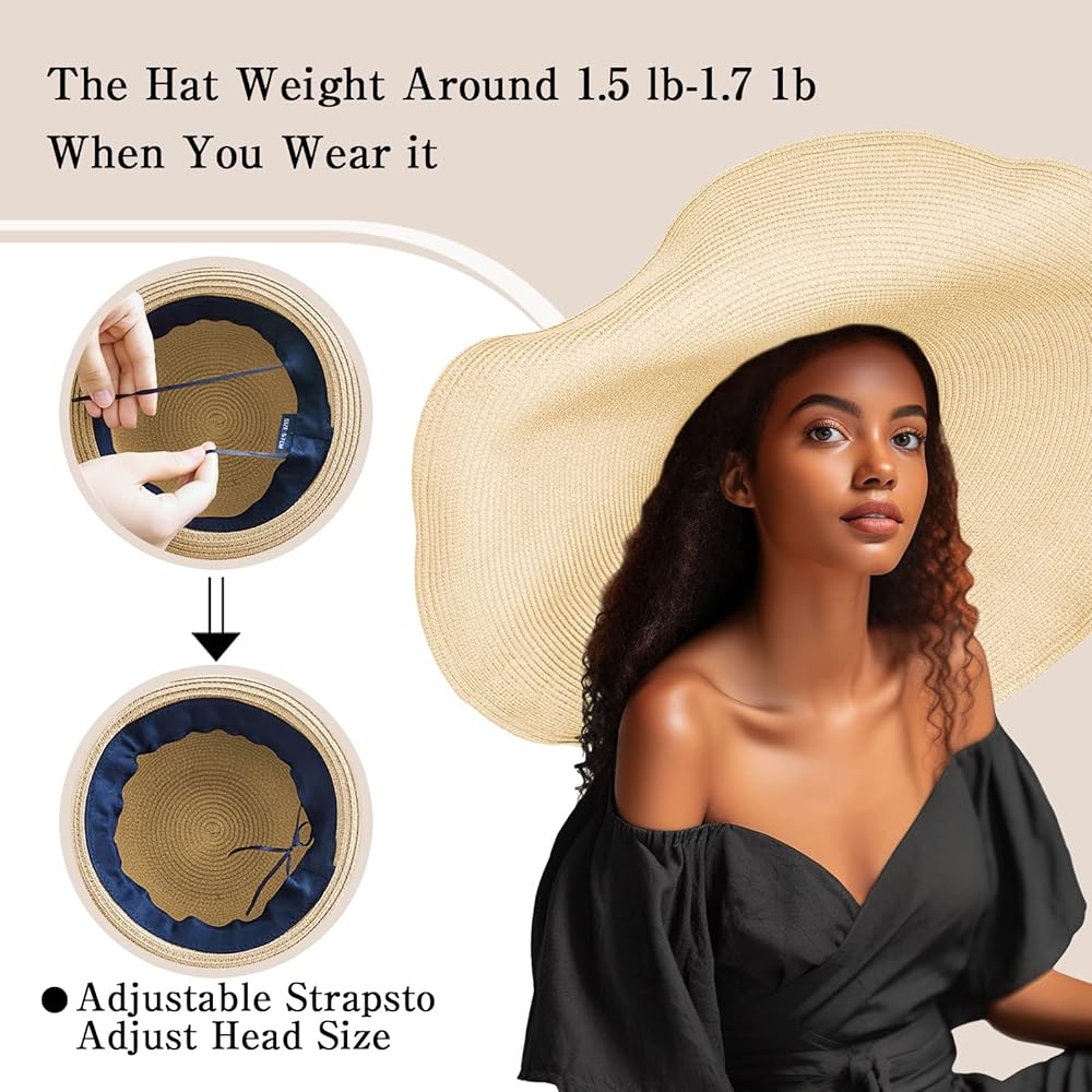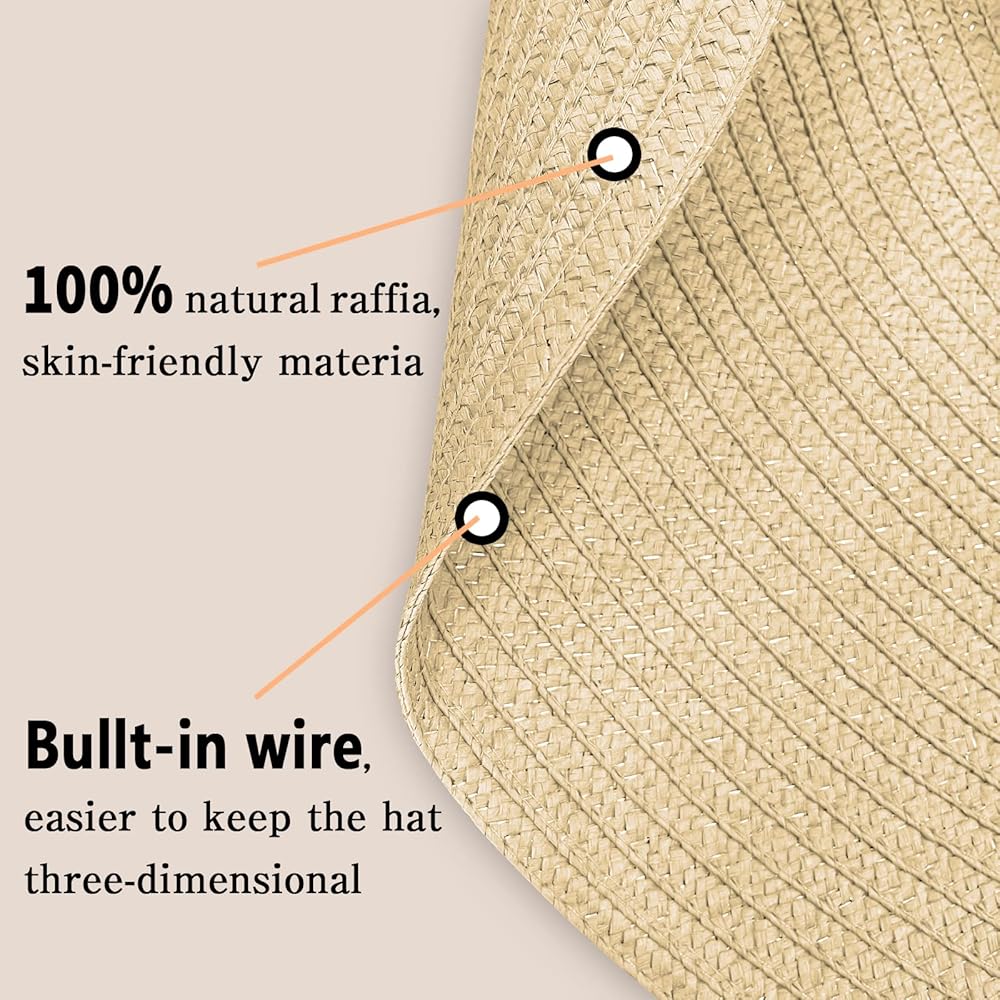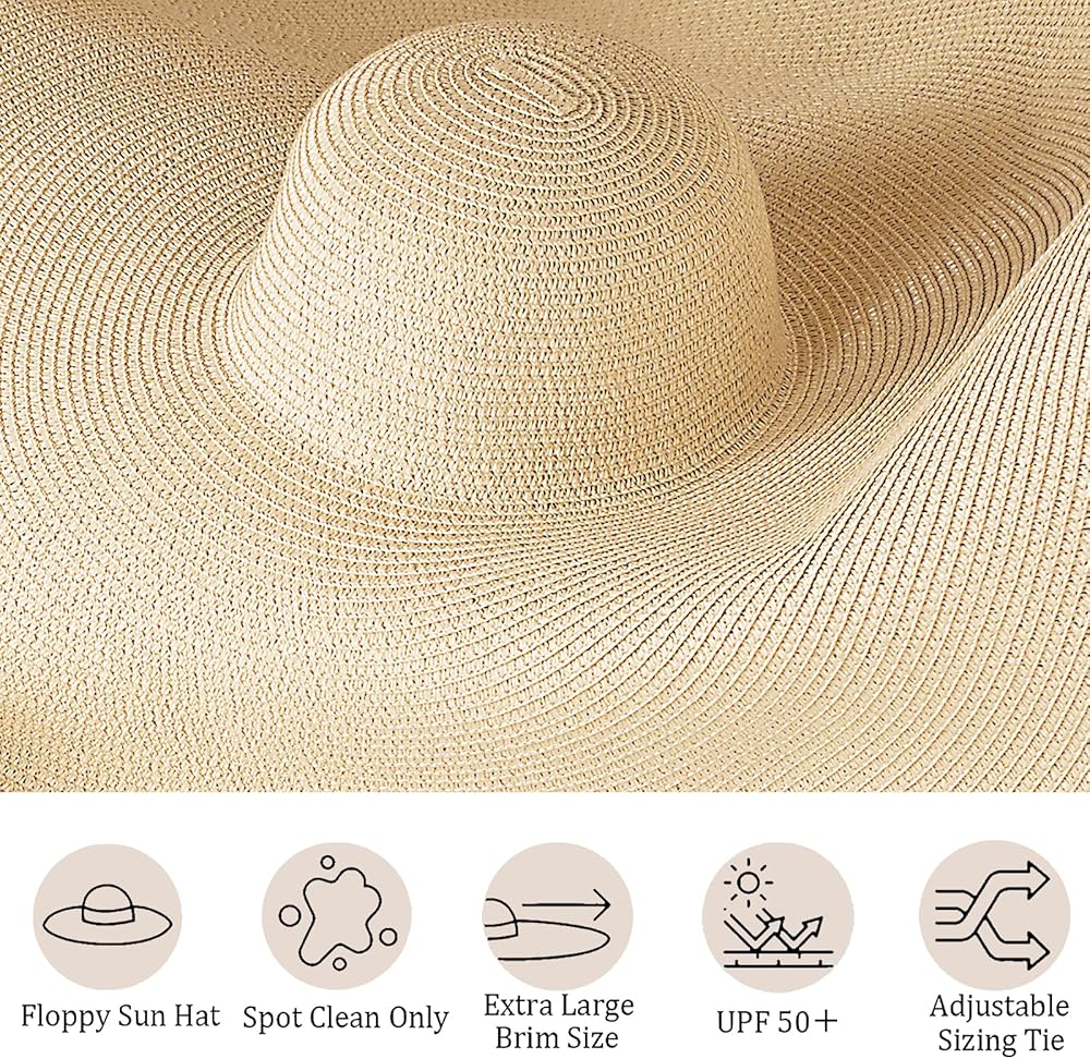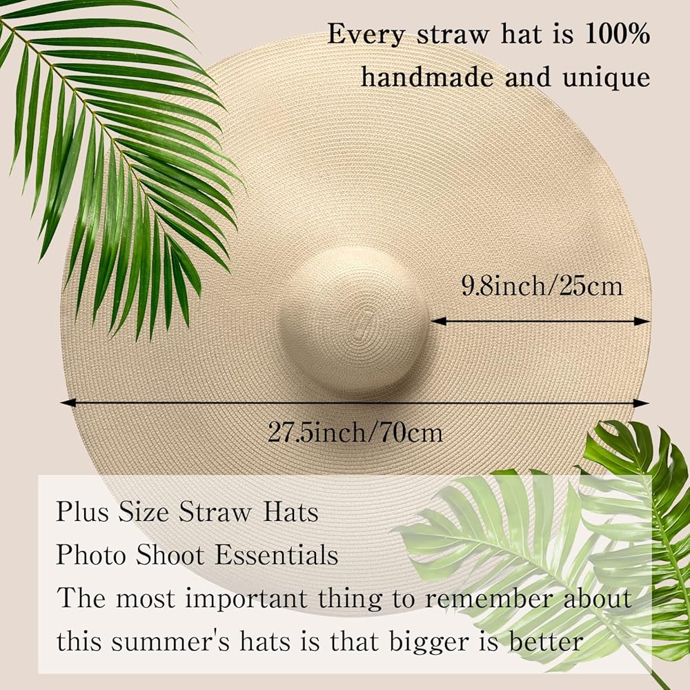 مادة القش الصديقة للبشرة: 100% ألياف القش الورقية. حافظ على انتعاشك في الأيام الحارة. أكثر مسامية ومريحة. هذه قبعة شاطئ كبيرة ذات حافة عريضة مقاس 70 سم (27.5 بوصة). حجم قابل للتعديل: مناسب لمحيط الرأس: 56-58 سم / 22 "-22.9"