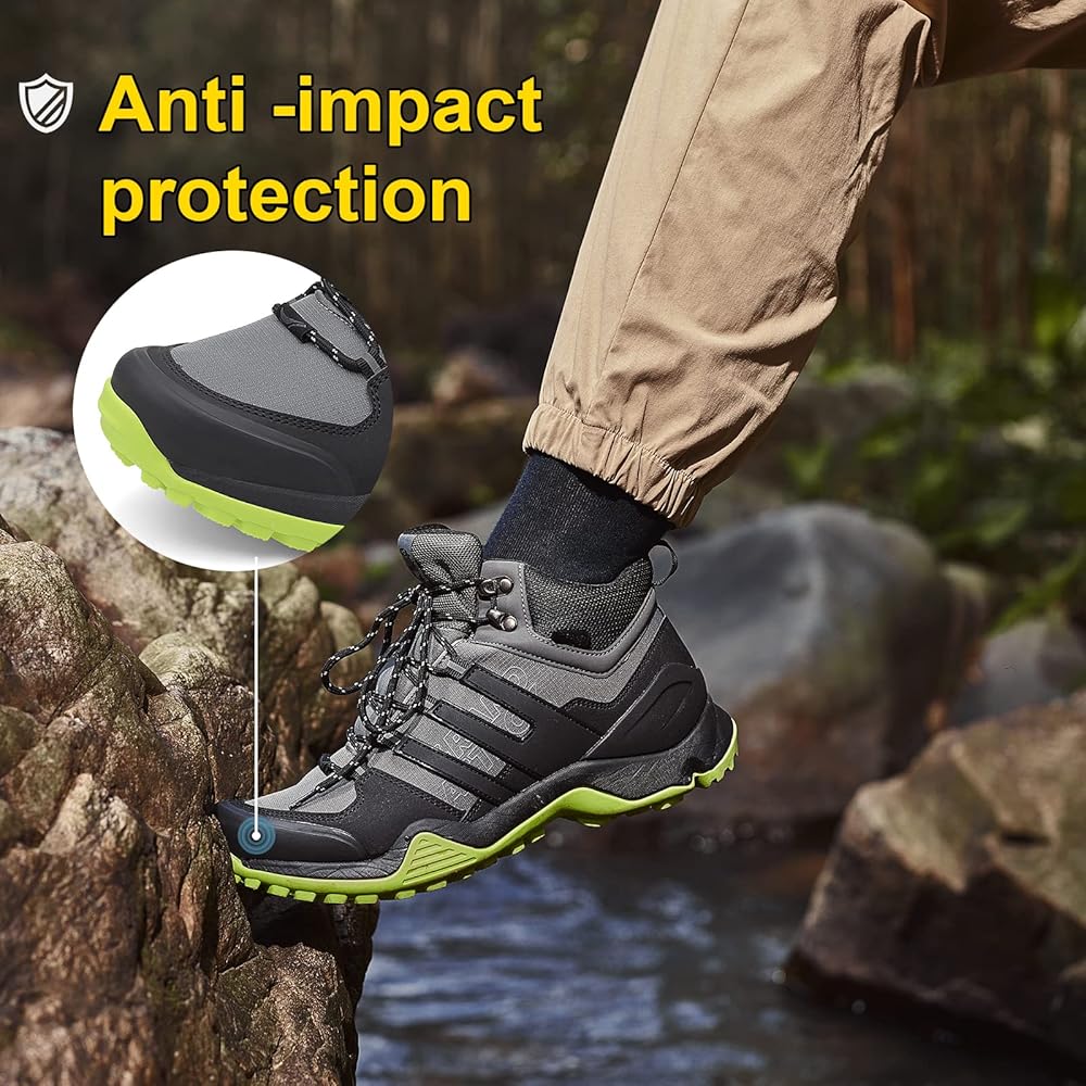 • 【تصميم الحماية】- تتميز أحذية المشي لمسافات طويلة الرجالية بمعدات حماية إضافية على إصبع القدم والكعب، والتي يمكن أن تحمي قدميك من الصدمات والإصابة.