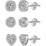 أقراط كبيرة مرصعة بالماس مقلدة: تتميز الأزرار الدائرية بقطر 0.27 بوصة/ 7 مم، في حين يبلغ قياس الأزرار المربعة وعلى شكل قلب 0.35 × 0.36 بوصة / 9.1 × 9.2 مم و0.3 × 0.29 بوصة / 7.8 × 7.5 ملم على التوالي. يبلغ طول أعمدة الأذن، المصنوعة من الفضة الإسترلينية، 0.39 بوصة / 10 ملم، وهي مناسبة تمامًا لأولئك الذين لديهم فصوص أذن واسعة.