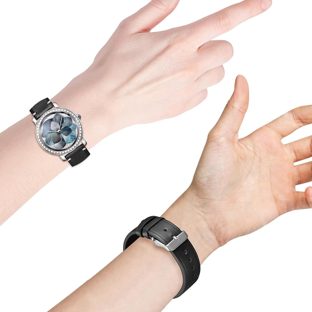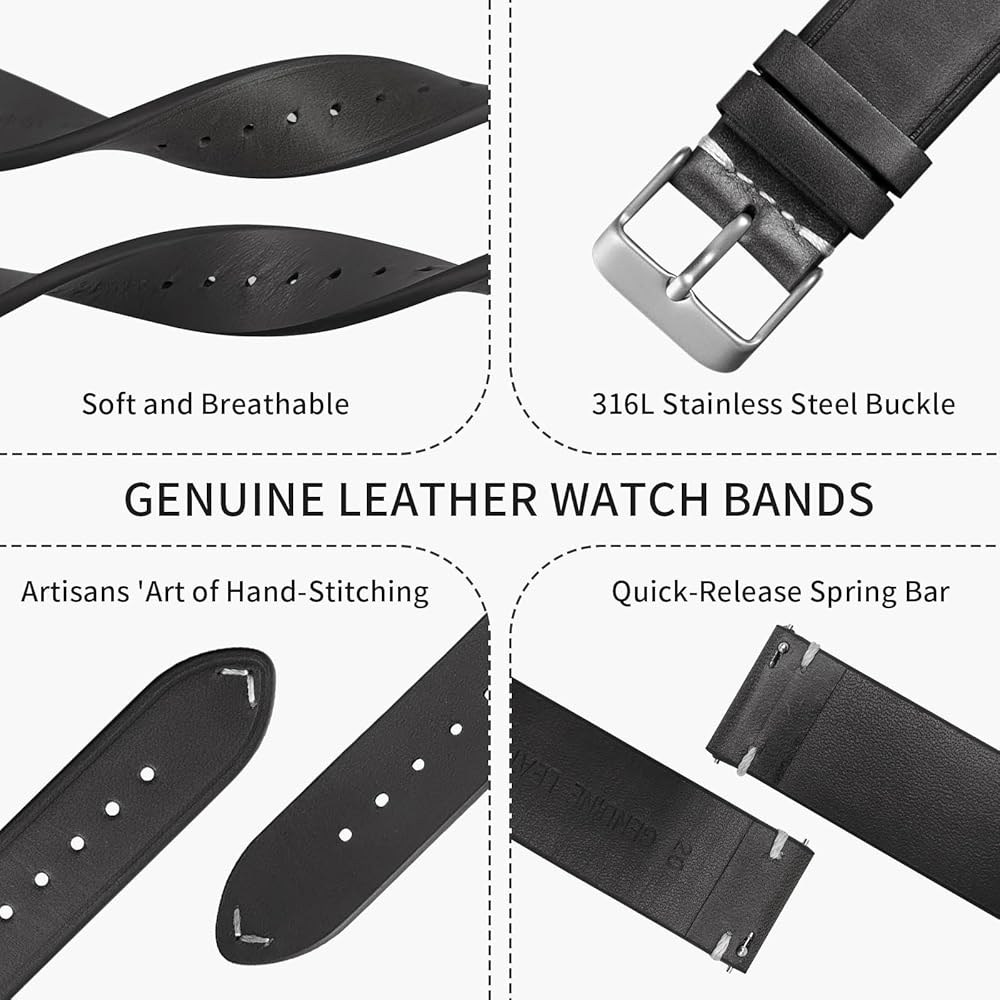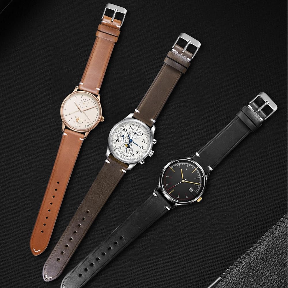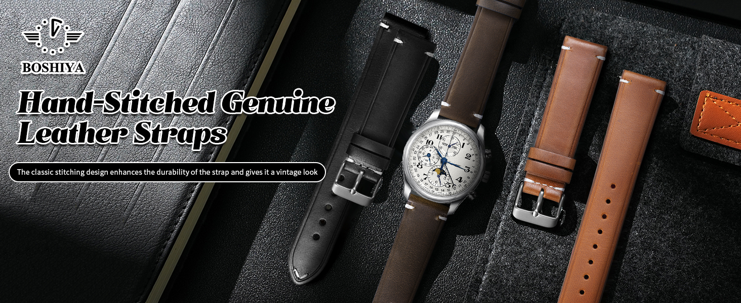 • 【مادة سوار الساعة الجلدية】الجزء الأمامي والخلفي مصنوعان يدويًا من جلد أصلي، ملمس جلد طبيعي، ملمس ناعم جدًا ورقيق، يمكن أن يناسب بشرة المعصم بشكل أفضل. إبزيم تانغ من الفولاذ المقاوم للصدأ 316L له صدى مع الغرز الموجودة على الذيل، مما يمنح الناس إحساسًا بصريًا فريدًا. قطع الجلود، وختم الحواف بالزيت، واللكم، والخياطة، كلها مصنوعة على يد أساتذة محترفين ماهرين.
