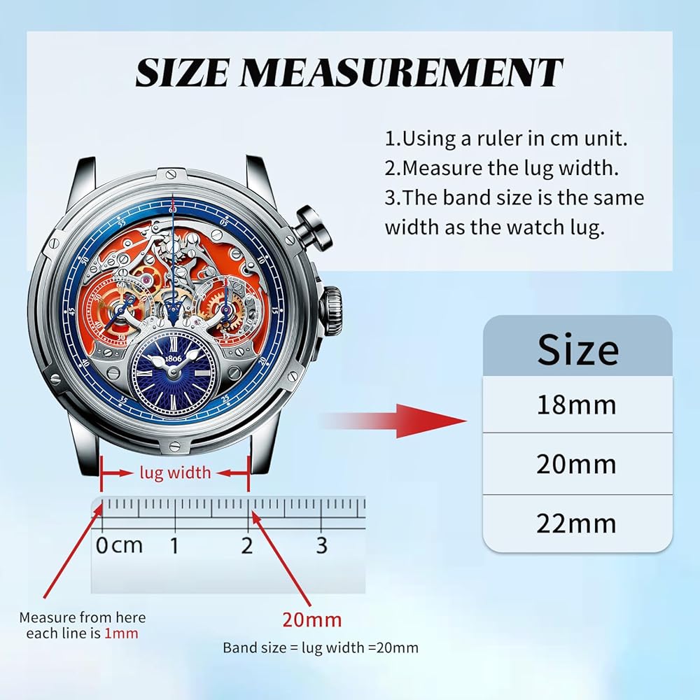 • عرض الساعة 20 مم: مناسب لأنواع مختلفة من الساعات التي تستخدم قضبان زنبركية 20 مم، مثل Seiko وTimex وFossil وCasio وCitizen وTissot وIWC وLongines وبعض الساعات الذكية مثل سلسلة Moto 360 Generation 2 وSamsung Galaxy وGear S2 Classic ، S3 Classic، S3 Frontier، Gear Sport وما إلى ذلك. ملاحظة: تناسب الساعة فقط بحجم عروة الساعة 20 مم.