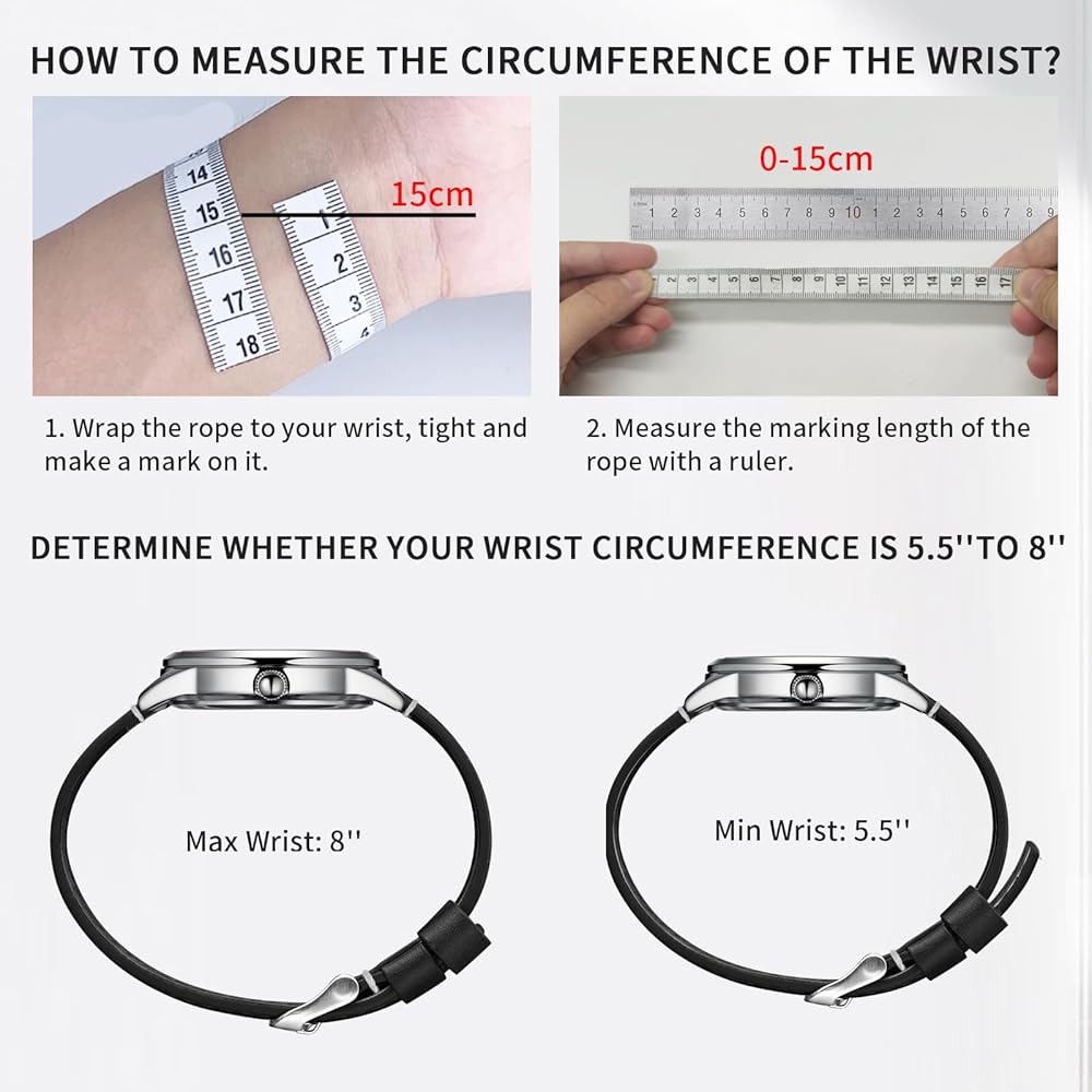 • 【توافق سوار الساعة الجلدي】يناسب معظم المعصم. الطول الإجمالي 7.9 بوصة تقريبًا عند عدم ربطه بالساعة (لا يشمل المشبك)؛ مصمم ليناسب المعصم من 5.5 بوصة إلى 7.9 بوصة، ولكن هندسة الساعة مناسبة أيضًا. (ملاحظة: إذا كان الحزام به خدش بسيط على السطح، فيرجى مسح حزام بقطعة قماش قطنية، يمكن عادة إصلاح الحزام. يرجى تجنب بقع الزيت. لا ننصح باستخدامه في الحمام أو حمام السباحة.)