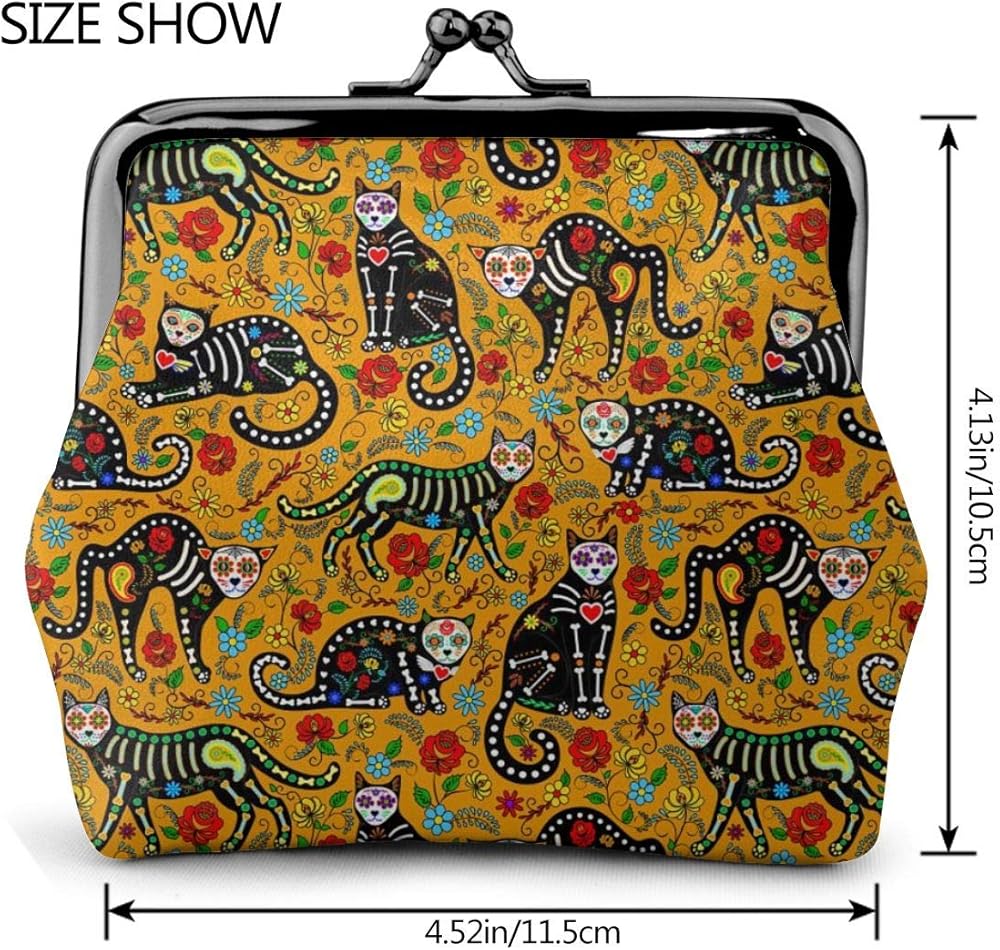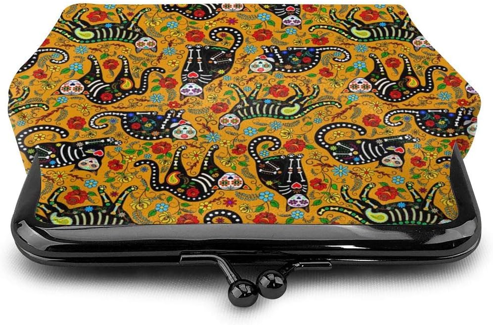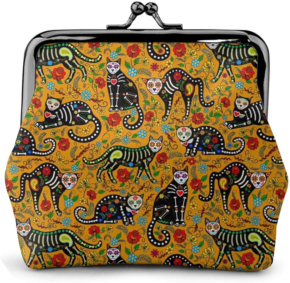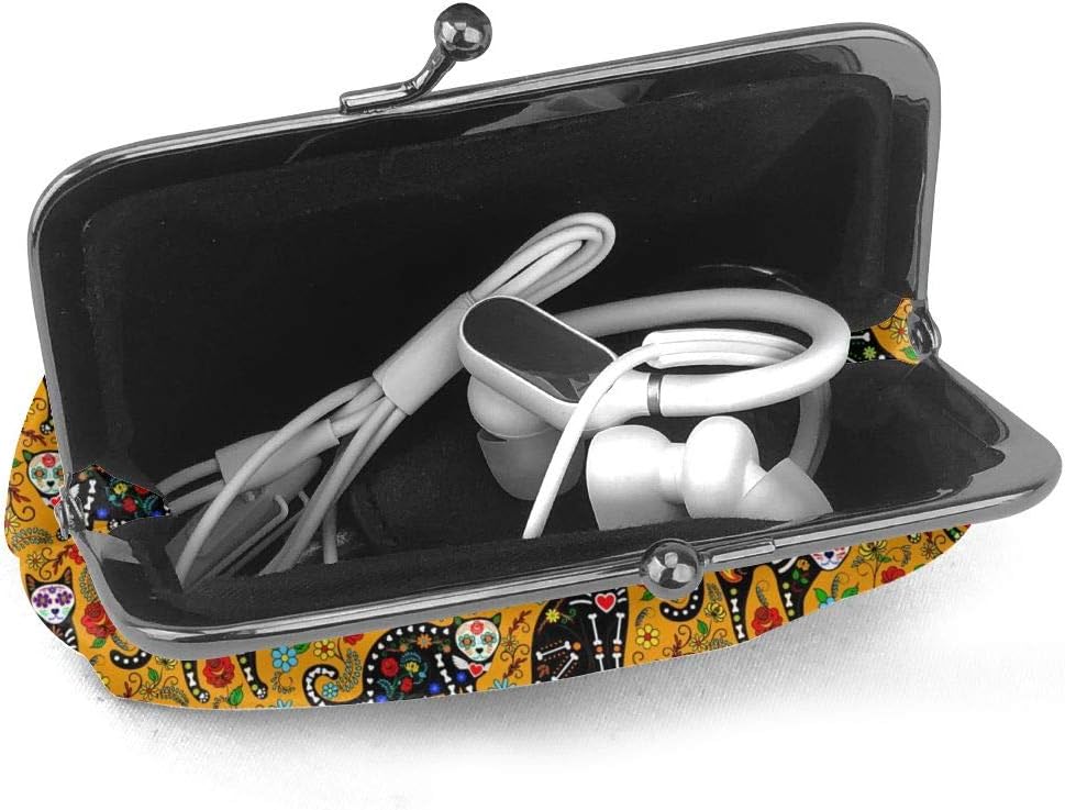 محفظة نقود معدنية للنساء من مكسيكان شوجر سكل آند بلاك كاتس ، حقيبة تغيير صغيرة مع مشبك إغلاق القبلة