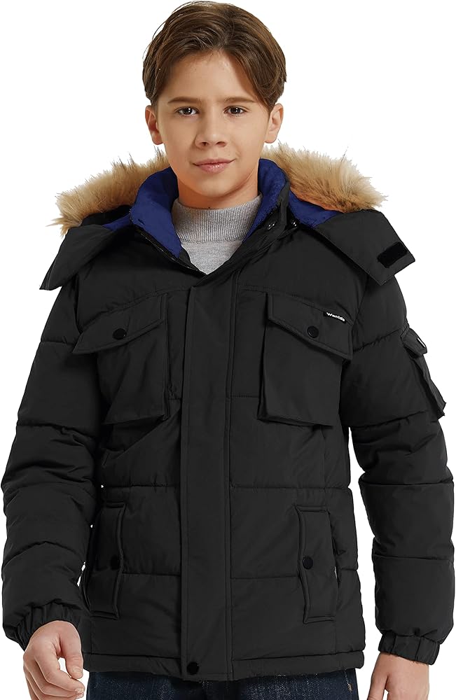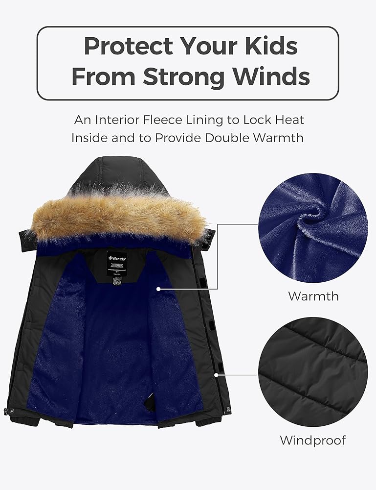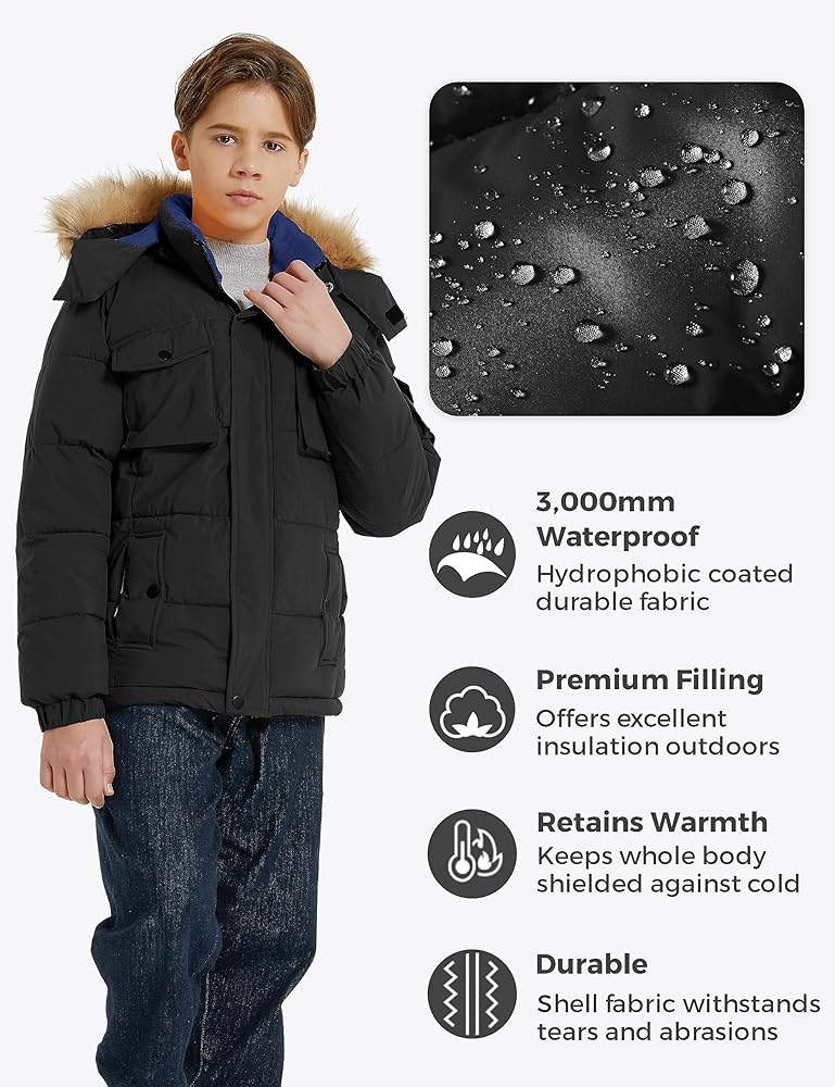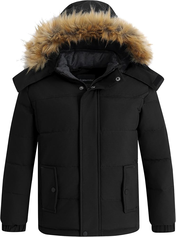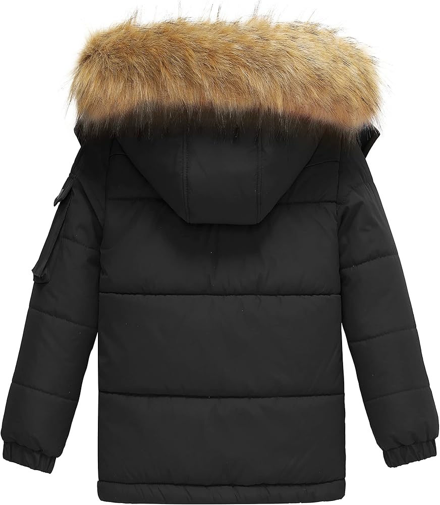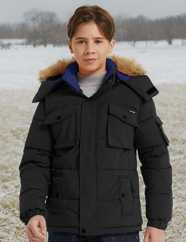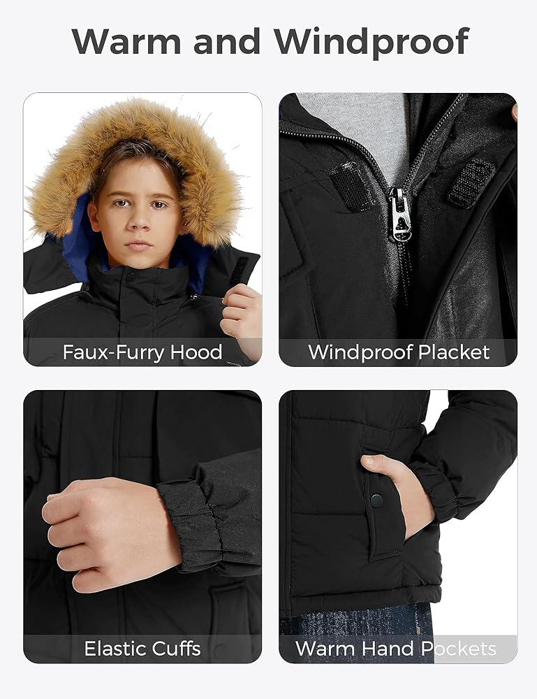 مليئة بالدفء والراحة - سترة شتوية مبطنة للأولاد مع غطاء رأس من الفرو الصناعي قابل للفصل يمكن أن تبقي أطفالك دافئين ومحميين من البرد، مصممة لتوفير الدفء والأناقة.