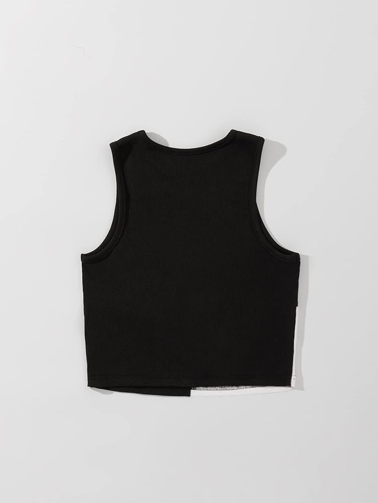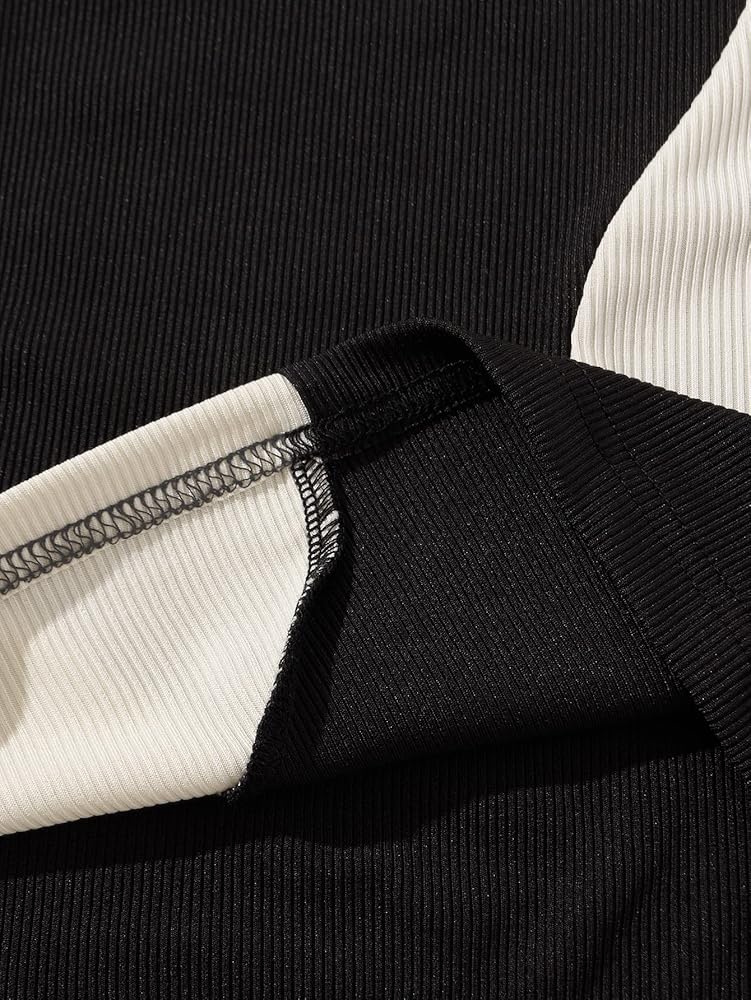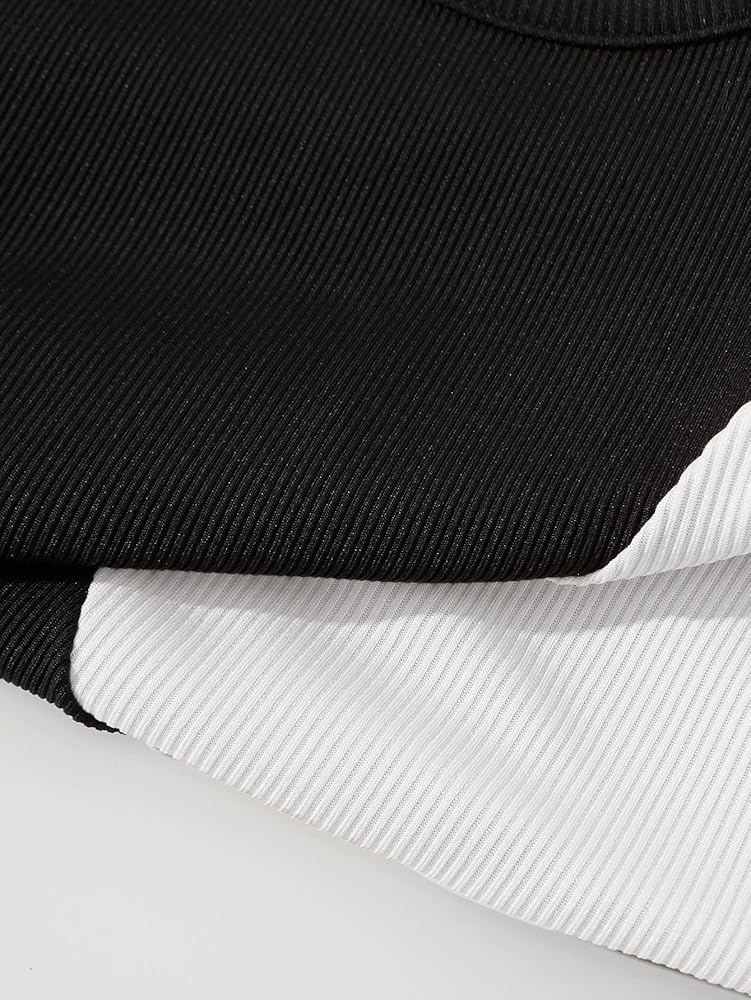 - رقبة دائرية، بدون أكمام، كتلة ألوان ثنائية اللون، نسيج مضلع، طول قصير