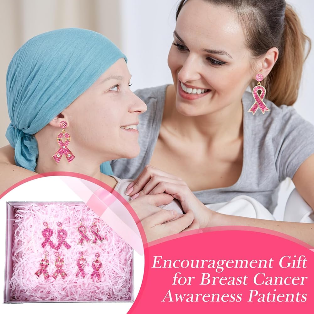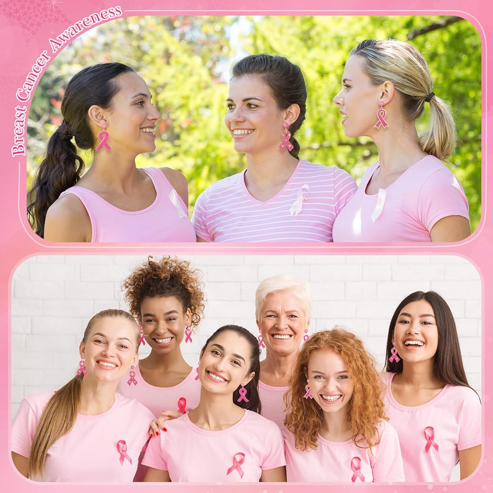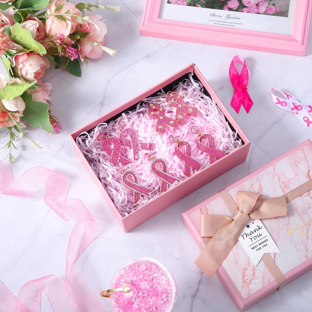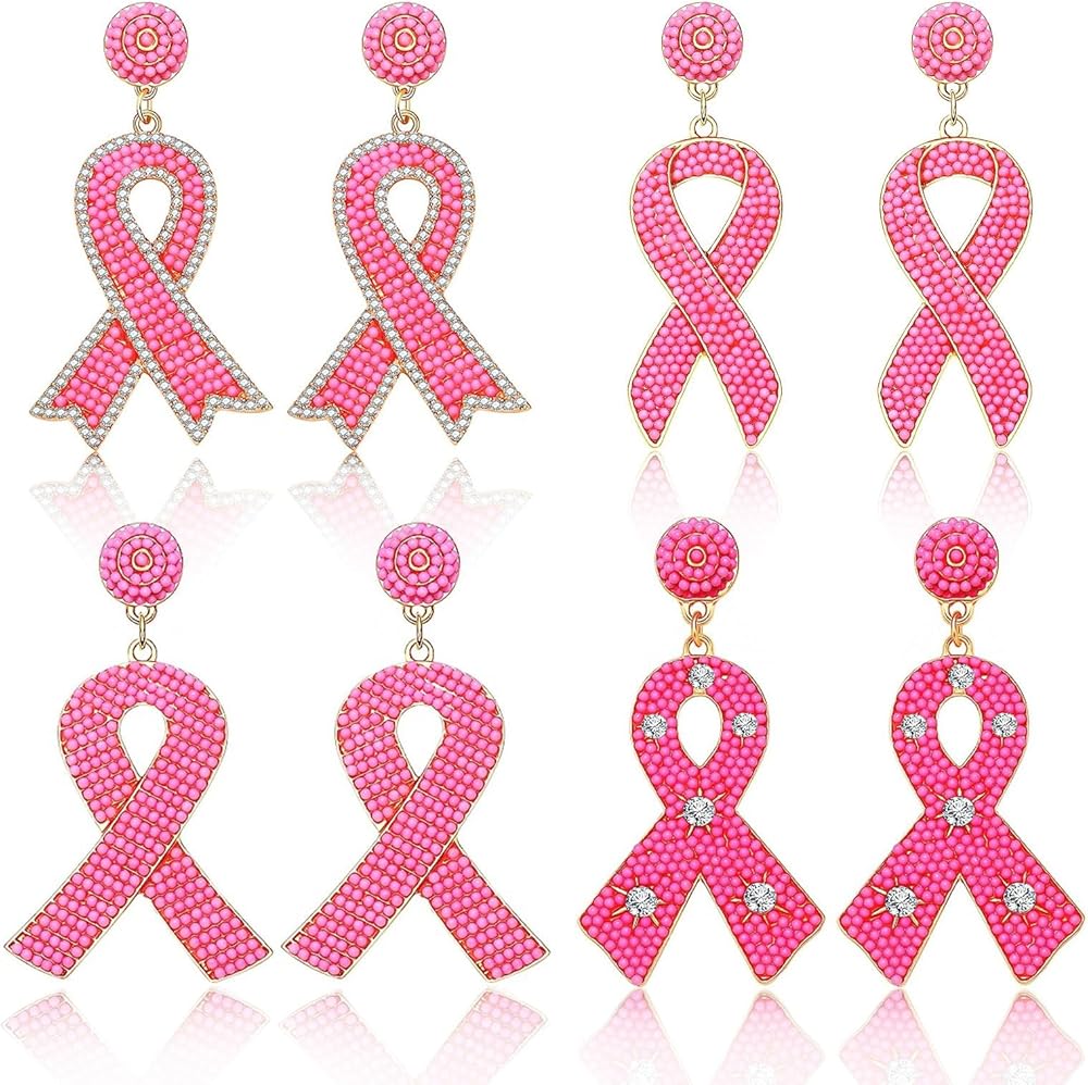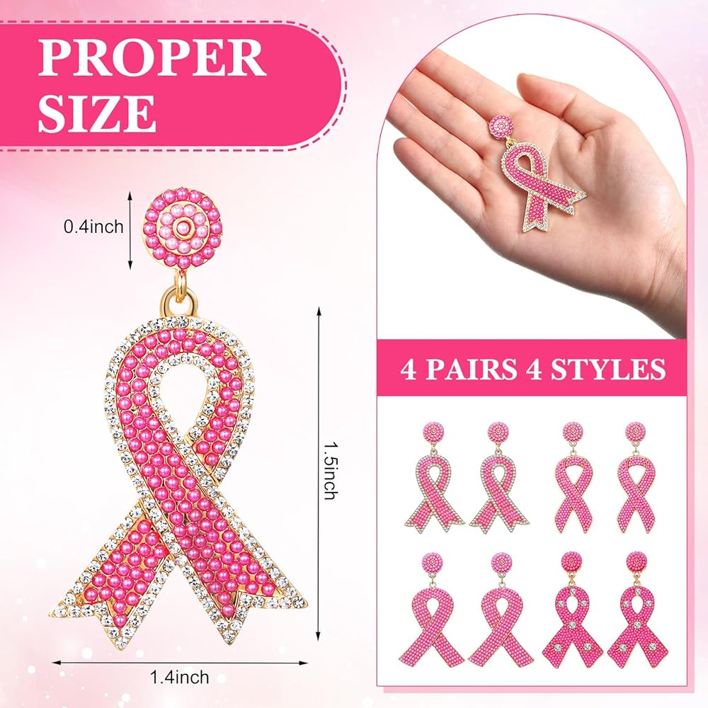 Tigeen 4 أزواج من الأقراط للتوعية بسرطان الثدي، شريط وردي، أقراط متدلية، هدايا الناجين للنساء، أقراط مصنوعة يدويًا، إكسسوارات للتوعية بسرطان الثدي من أجل لوازم الحفلات الخيرية