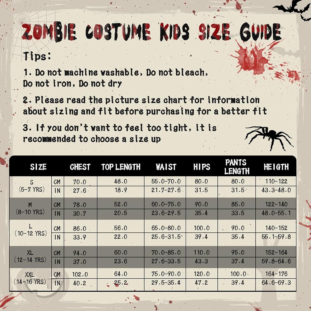 • مواد عالية الجودة: نحن نعطي الأولوية لأطفالك بالراحة والأمان، وهذا هو السبب في أن مجموعة أزياء زومبي للأطفال لدينا مصنوعة من مواد عالية الجودة. القميص والبنطال مصنوعان من قماش متين ليتحمل ساعات طويلة من اللعب. قناع الزومبي مصنوع من شريط مطاطي ناعم يلائم رأس أطفالك بشكل آمن دون التسبب في عدم الراحة.