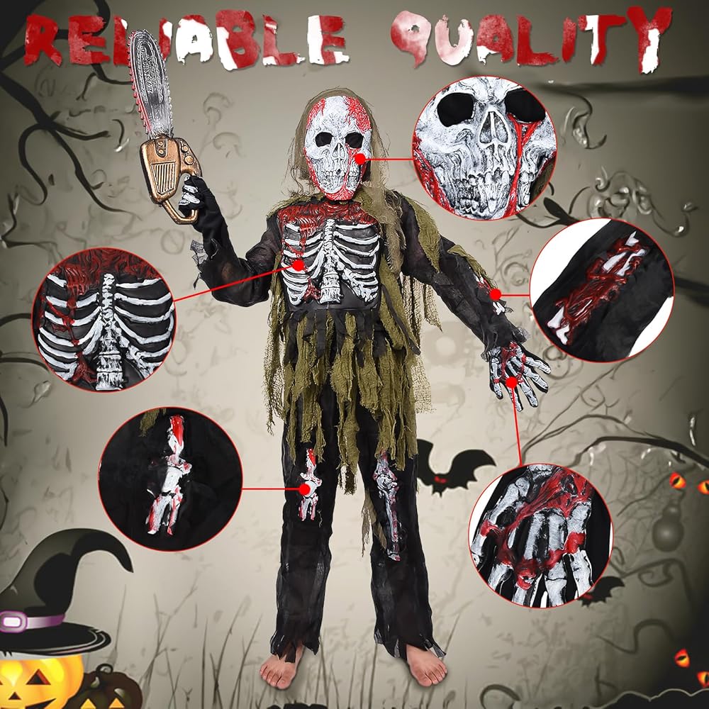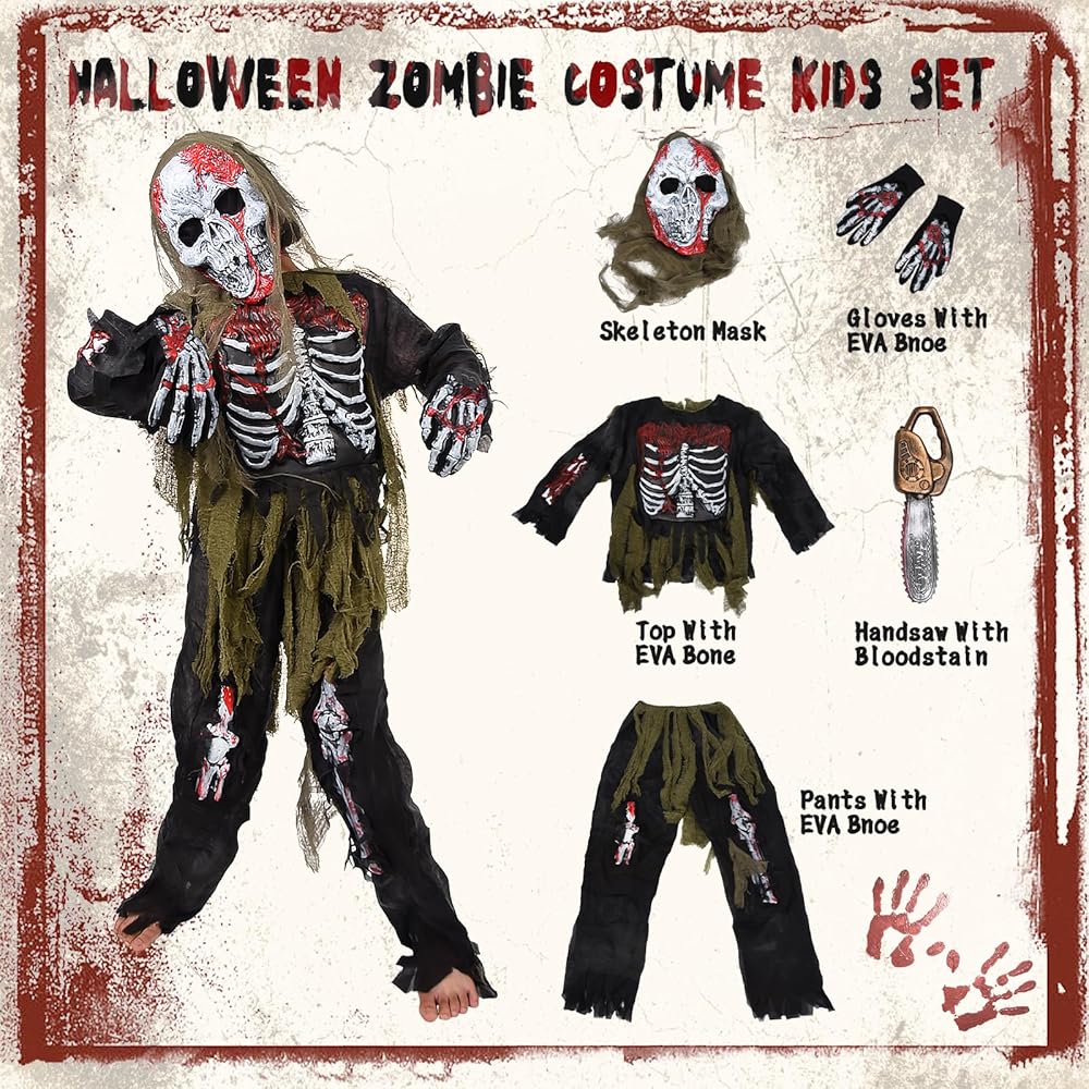 زي نيراجرون زومبي للأطفال، مجموعة زي زومبي هيكل عظمي مخيف للهالوين للأطفال الذين يعيشون زي زومبي ميت مع ألعاب بالمنشار وقفازات هيكل عظمي وقناع زومبي وقميص وسراويل مع عظام