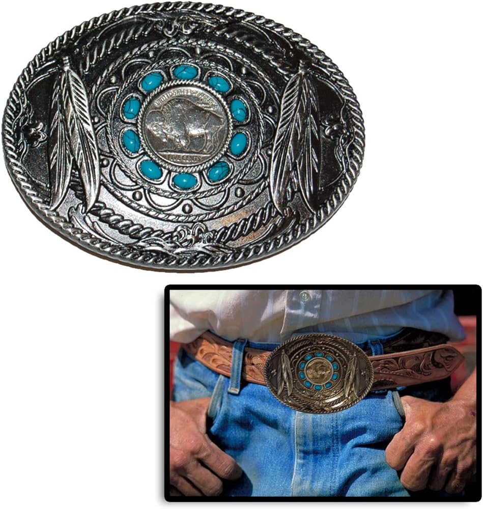 يتميز مشبك الحزام المستوحى من الأمريكيين الأصليين هذا بنيكل بافلو الأصلي. يعرض الإبزيم تصميمات غربية وأمريكية أصلية، بما في ذلك تصميمات الحبال والريش وحلقة من الفيروز الصناعي حول نيكل بافلو في منتصف الإبزيم. يتميز الإبزيم بجانب بافالو للعملة. يحتوي الإبزيم على ملحقات قياسية لأي حزام ويقدم عرضًا رائعًا لأي مناسبة. تم سك نيكل بافالو الكلاسيكي والمحبوب من 1913-1938. تحتفل بثقافة وتراث الغرب الأمريكي، وتُعرف التصميمات بأنها من أجمل التصاميم وأكثرها فنية على الإطلاق على العملة المعدنية. تم سك آخر عملة منذ أكثر من 75 عامًا في عام 1938. تم تصميم العملة من قبل النحات الشهير جيمس إيرل فريزر، الذي اشتهر بصوره الدرامية للغرب الأمريكي. التصميم الجميل والفني يجعل هذه العملة الأمريكية المثالية واحتفالًا فريدًا بثقافة وتراث الغرب المتوحش. الوجه هو صورة مركبة لثلاثة زعماء أمريكيين أصليين: ايرون تيل (سيوكس الذي قاتل ضد كاستر في ليتل بيغورن وكان نجمًا في عرض الغرب المتوحش)، وقمرين (شايان قاتل أيضًا في ليتل بيغورن) ونجم الفيلم جون بيج تري (سينيكا). الثلاثة كانوا على قيد الحياة عندما تم إصدار العملة لأول مرة. يتميز الجزء الخلفي بصورة مذهلة لجاموس بلاك دايموند الذي كان نقطة جذب في حدائق الحيوان في نيويورك. كان الجاموس رمزًا للغرب الأمريكي، ولكنه انقرض تقريبًا عندما تم تصنيع أول بافالو نيكل في عام 1913. كان بلاك دايموند حيًا أيضًا عندما تم سك نيكل بافالو لأول مرة. تم ارتداء معظم نيكل بافالو أو تلفه أثناء الدورة الدموية أو تم تدميره من قبل حكومة الولايات المتحدة عندما تم تقديم جيفرسون نيكل في عام 1938، مما يترك القليل لهواة جمع العملات اليوم.